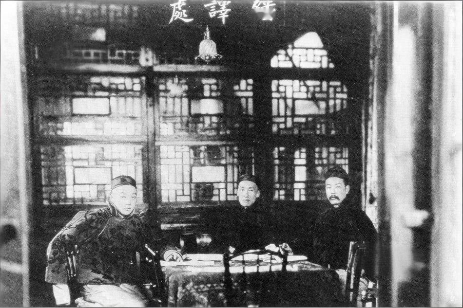19世纪70年代,上海江南制造总局翻译馆内,三位中国近代科学先驱并排而坐,从左至右依次为:徐寿,近代著名化学家、科学翻译;李善兰,近代最杰出数学家;华衡芳,数学家、天文学家、翻译家。 三人均身着清代长袍马褂、神情严肃,头顶悬挂煤气灯(当时先进照明设备),上方匾额清晰书写“翻译馆”三字,格子窗透进光线,整体氛围庄重而学术。 江南制造总局是中国近代规模最大、持续时间最长的军工企业,除造船、制炮、炼钢外,还设有翻译馆,是中国近代最早、最重要的西学翻译机构。翻译馆由徐寿和英国传教士傅兰雅共同主持,专译西方科技书籍。