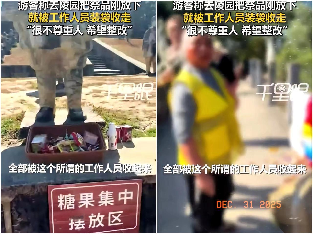 云南保山烈士陵园,一个外地男人刚把祭品放下。 他转身还没走两步,就听见身后“哗啦”一声。 回头一看,好家伙,一个穿工作服的人正把他买的水果点心,连同别人篮子里的东西,一股脑往大麻袋里倒,动作麻利得像在扔垃圾。 男人急了,几步跨回去质问,对方却眼皮都不抬,说是公司规定要“及时清理”。可看看旁边那三大袋鼓鼓囊囊的“心意”,阳光下一刺眼,男人的心更不是滋味。 他从几百公里外来,每一样祭品都摆得小心翼翼,以为这份敬意能多留一会儿,结果,连个背影的时间都没给。 祭拜,祭的是心,不是东西!心还没放下,东西就成了垃圾,这规矩,合理吗?
