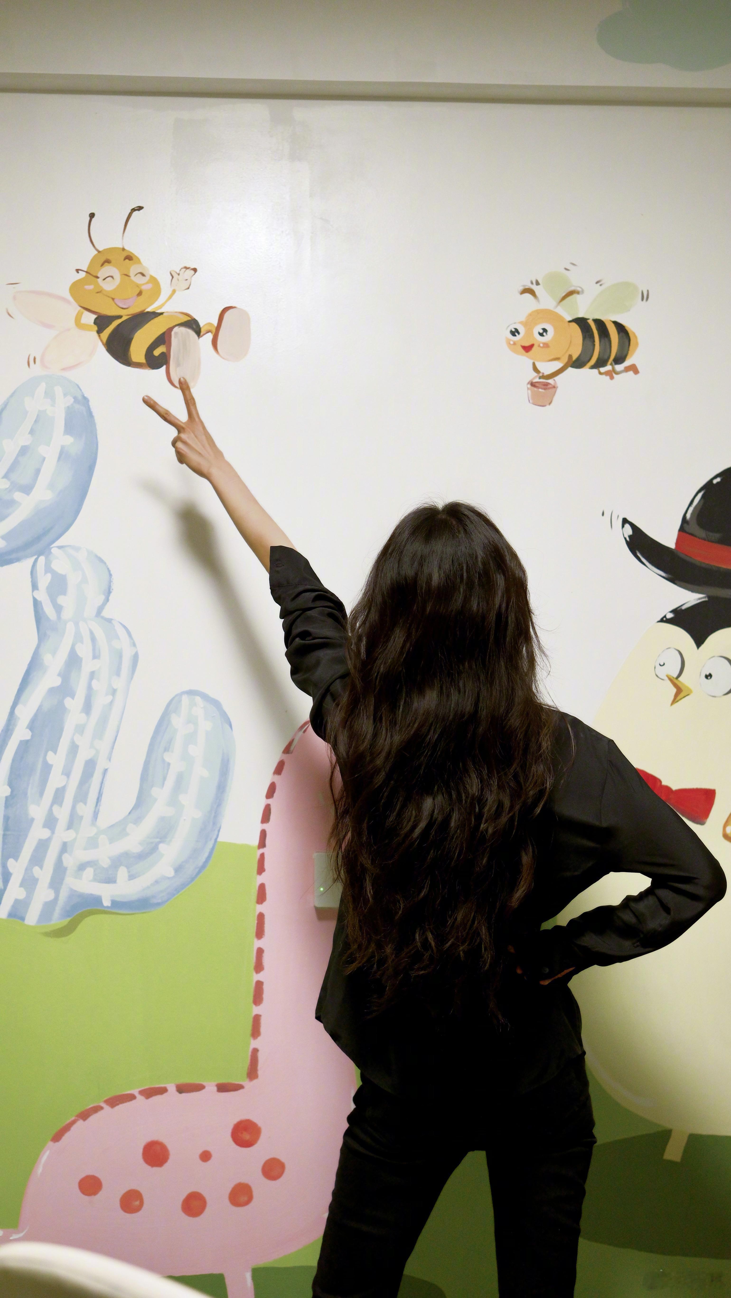杨幂 穿着的衣服上是小猫,比耶指的方向是我们小蜜蜂🐝,都是杨幂爱着的呀