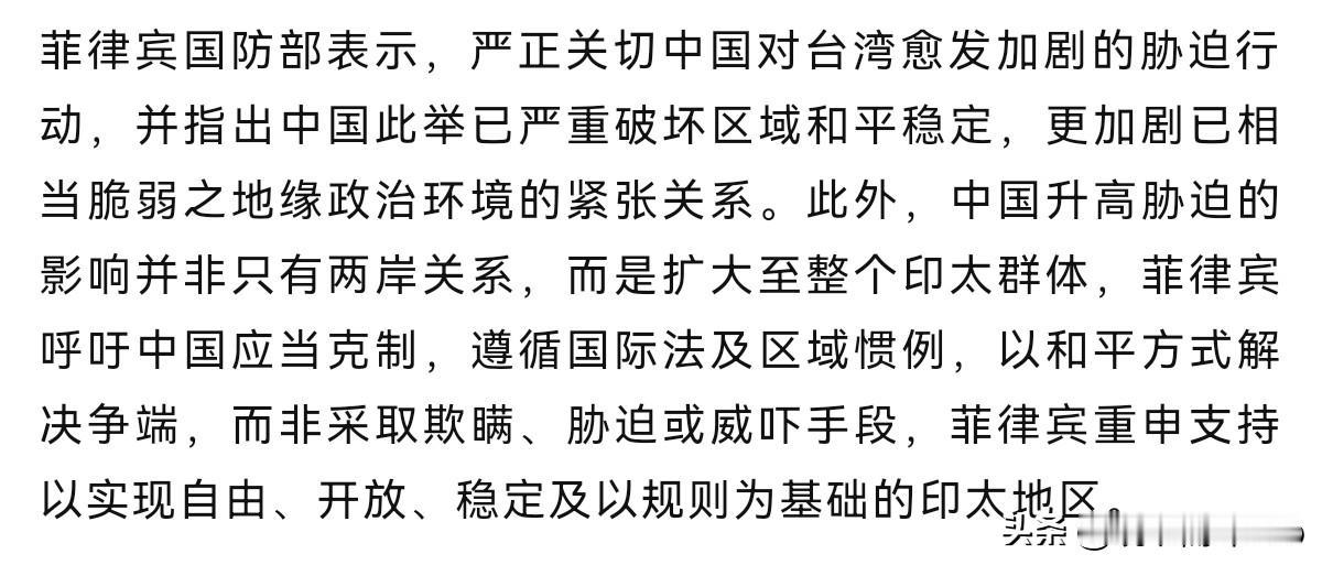 自不量力!菲律宾竟然跳出来对我们说三道四了!12月31日,菲律宾国防部发表声明声称,严正关切中国对台湾愈发加剧的“胁迫”行动,中国此举已“严重破坏”区域和平稳定,更加剧已相当脆弱之地缘政治环境的紧张关系。中国升高胁迫的影响并非只有两岸关系,而是扩大至整个印太群体。 菲律宾呼吁中国应当克制,遵循国际法及区域惯例,以和平方式解决争端,而非采取欺瞒、胁迫或威吓手段,菲律宾重申支持以实现自由、开放、稳定及以规则为基础的印太地区。很显然,我们处理家务事,没想到菲律宾方面竟然公开跳出来跟我们唱对台戏了。 菲律宾进行这样的声明目的是什么呢?恐怕原因有三。其一,菲律宾在台湾问题上对我们挑衅,无非就是对美国表忠心,向美国证明,菲律宾可以当美国的马前卒。其二,菲律宾意在借题发挥,要扭转自身在南海问题上的挑衅者和麻烦制造者的角色,意欲以此拉拢一些东南亚国家,削弱我们与东南亚国家的互信。 其三,其目的明显有挑动国内反华情绪,转移矛盾,捞取政治资本的考量。不过,在我们看来,菲律宾要干涉我们的内政,纯属是自己给自己找不自在,不过是一个无足轻重的角色。东南亚各国都希望区域和平,只有菲律宾不长眼,持续挑事,这样的国家只会被区域国家孤立。当然,我们也无需过于在意这种上蹿下跳的角色。如果其在台湾问题上不长眼,妄图介入,菲律宾必然会成为我们打击的目标。