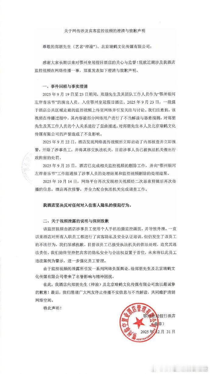 泄露梓渝监控酒店员工被行拘 泄露梓渝监控酒店发布致歉声明,称当时泄露监控的员工已被行政拘留处罚,酒店已删除监控视频。