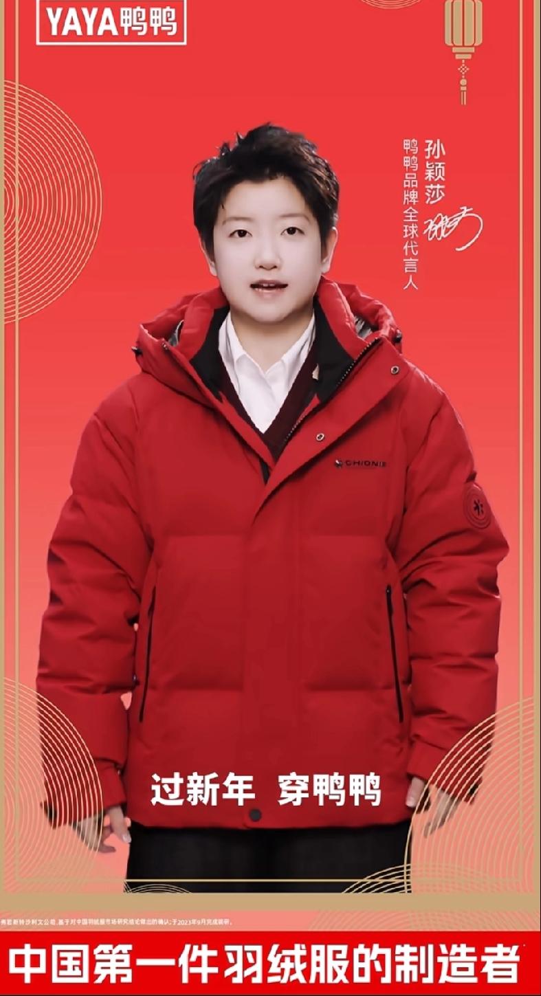 🎉新年穿新衣,温暖又喜气!🎉 鸭鸭羽绒服全球代言人孙颖莎带着满满的红运祝福来啦!❤️ 这个冬天,和莎莎一起穿上红红火火的鸭鸭羽绒服,把温暖和好运都穿在身上。 新的一年,愿我们都能像莎莎一样,活力满满,“羽”众不同! 孙颖莎 鸭鸭羽绒服 过新年穿鸭鸭