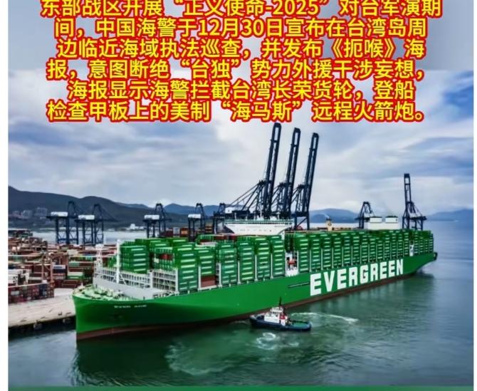 中国海警发布海报,拦截美国武器运输船,敢运海马斯就没收! 1. 发布背景:2025年12月30日,中国海警在台岛周边及马祖、乌丘附近海域执法巡查时,发布《扼喉》《巡控》《缉“独”》系列海报,与东部战区12月29日“正义使命-2025”军演形成呼应。 2. 视觉亮点:《扼喉》海报展现海警舰艇编队+直升机立体封控,执法员索降登载有“海马斯”的台“长荣”货轮,手铐元素明示违法追责;《巡控》以“越拉越紧”的平结喻管控升级,《缉“独”》用渔网、鱼叉象征“外援进不来、独派逃不出”。 3. 执法依据:《中华人民共和国海警法》明确,我国管辖海域内,海警可对非法载运武器的船舶拦截、登临、查扣,拒不服从者可使用警械甚至武器。 二、局势背景解读 1. 核心矛盾:台“长荣”“阳明海运”曾两次用民用货轮(隐去标识)运送美制M1A2T坦克,此次企图以“民用”为幌子运输“海马斯”,规避军事运输敏感点。 2. 关键逻辑:“民用船运军火”即失去民用属性,可被视同军事目标,海警执法是“断台独外援后勤”,军演是“军事硬威慑”,形成“法律+军事”双轨管控。 3. 武器现状:“海马斯”在俄乌冲突中因GPS易受干扰曾“完全失效”,美方虽计划升级抗干扰套件,但无法改变其在台海的管控困境。 这就是中国的立场和决心!