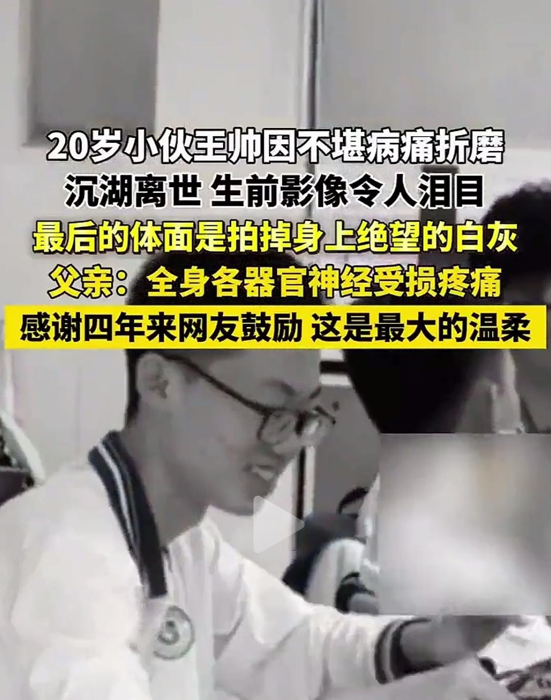 他拍掉身上的白灰时,该是想留住最后一点体面吧。20岁的王帅,人生本该是骄阳炙烈的盛夏,却被病痛揉成了满是裂痕的薄冰,最终沉进湖水里,告别了这场磨人的疼痛。 旁人眼里,那不过是轻飘飘的一层白灰,可于他而言,那是四年里日夜啃噬的神经痛、是全身器官受损的煎熬、是攥紧拳头也止不住的颤抖。他曾试着接住网友的鼓励,把那些温柔攒起来当作对抗病痛的铠甲,可当疼痛的潮水一次次漫过胸口,铠甲终究还是被泡得锈迹斑斑。 我们总说熬过去就好了,可有些苦,真的重到让人熬不动。他才20岁,还没来得及看遍山川湖海,没来得及尝遍人间烟火,却先被病痛判了退场。最后拍掉白灰的那个动作,像极了他在跟这糟糕的世界说:就算要走,我也要干干净净地走。 父亲说他全身器官神经受损,那是怎样的疼?是深夜里蜷在床上不敢出声,还是连呼吸都带着针扎的滋味?我们无从体会,只能隔着屏幕,对着那个年轻的身影红了眼眶。 这世间的温柔,有时真的赶不上苦难的脚步。可那些网友四年来的鼓励,终究还是成了他生命里一点暖。他记着这份温柔,我们也记着这个拍掉白灰的少年,他不是败给了生活,只是败给了无解的病痛。 愿湖水下的世界没有疼痛,愿20岁的王帅,能在另一个维度,真正活成骄阳。