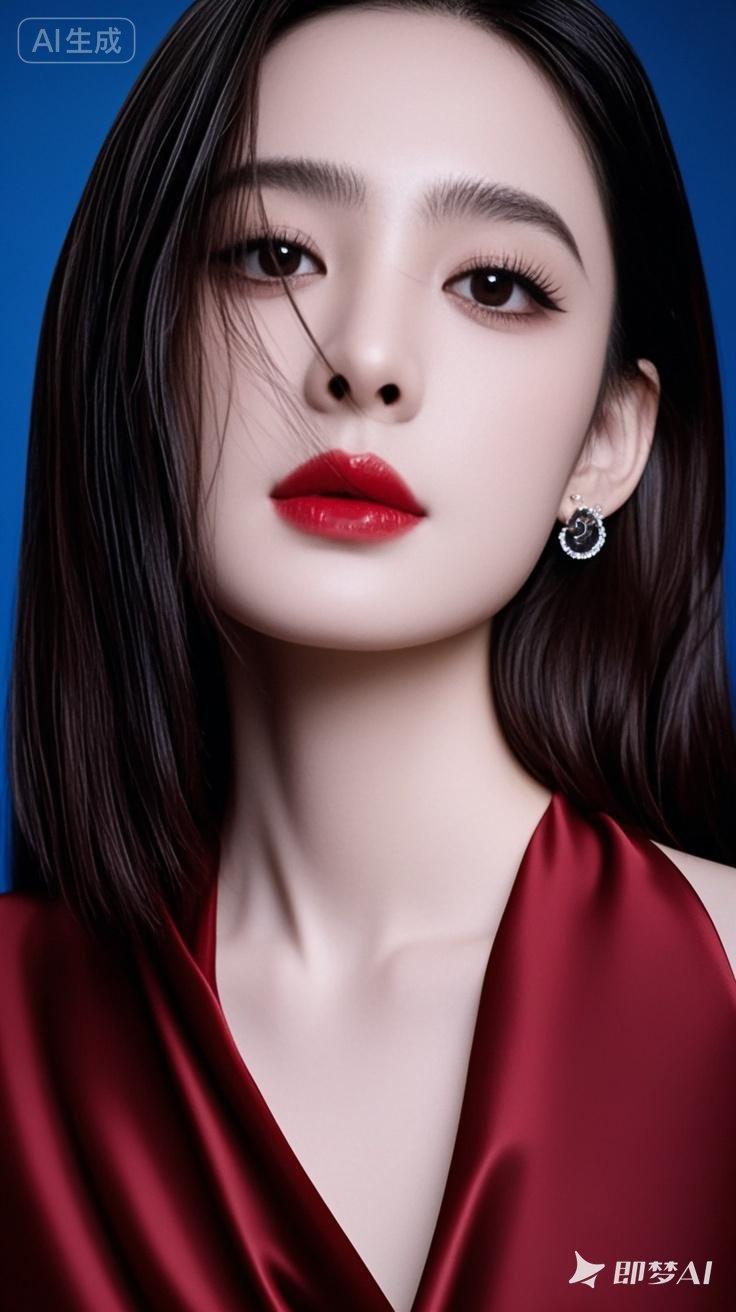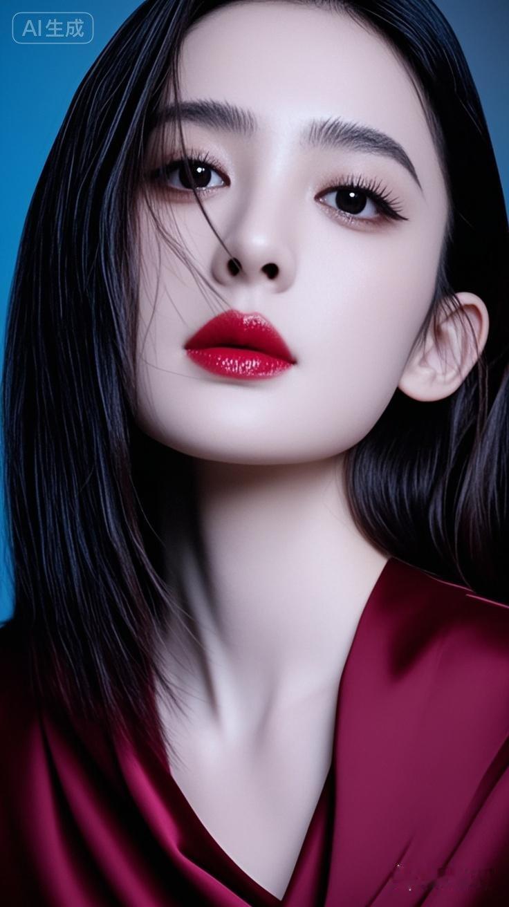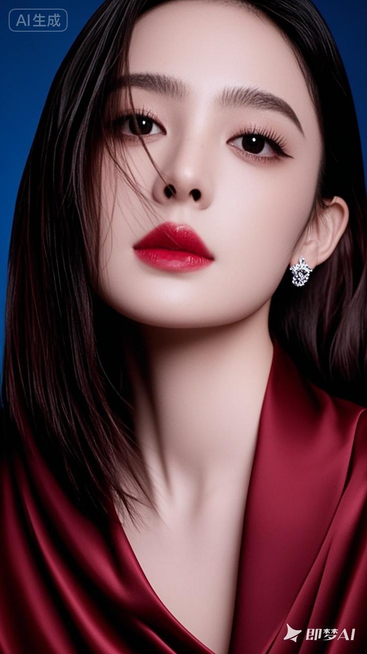 绛紫缎裙揉进优雅,低盘发衬出精致颈线,红唇浅笑的瞬间,在蓝调背景里凝成一抹惊艳的