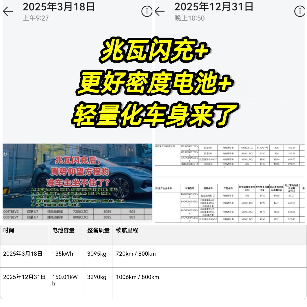 仰望U7在2025年3月18日和2025年12月31日分别申报了两个版本。 主要信息如下: 早期版本(2025年3月18日): 135kWh电池包 整备质量为3095kg(约3.1吨) 续航里程为720km和800km,后者未上市。 最新版本(2025年12月31日): 电池包容量提升至150.01kWh 整备质量反而降至3290kg(约3.29吨) 采用了能量密度更高的新型电池,在容量增加的同时,电池包的重量没有明显增加。显然优化了车身结构或使用了更轻的材料,实现了"减重又增程"的效果。