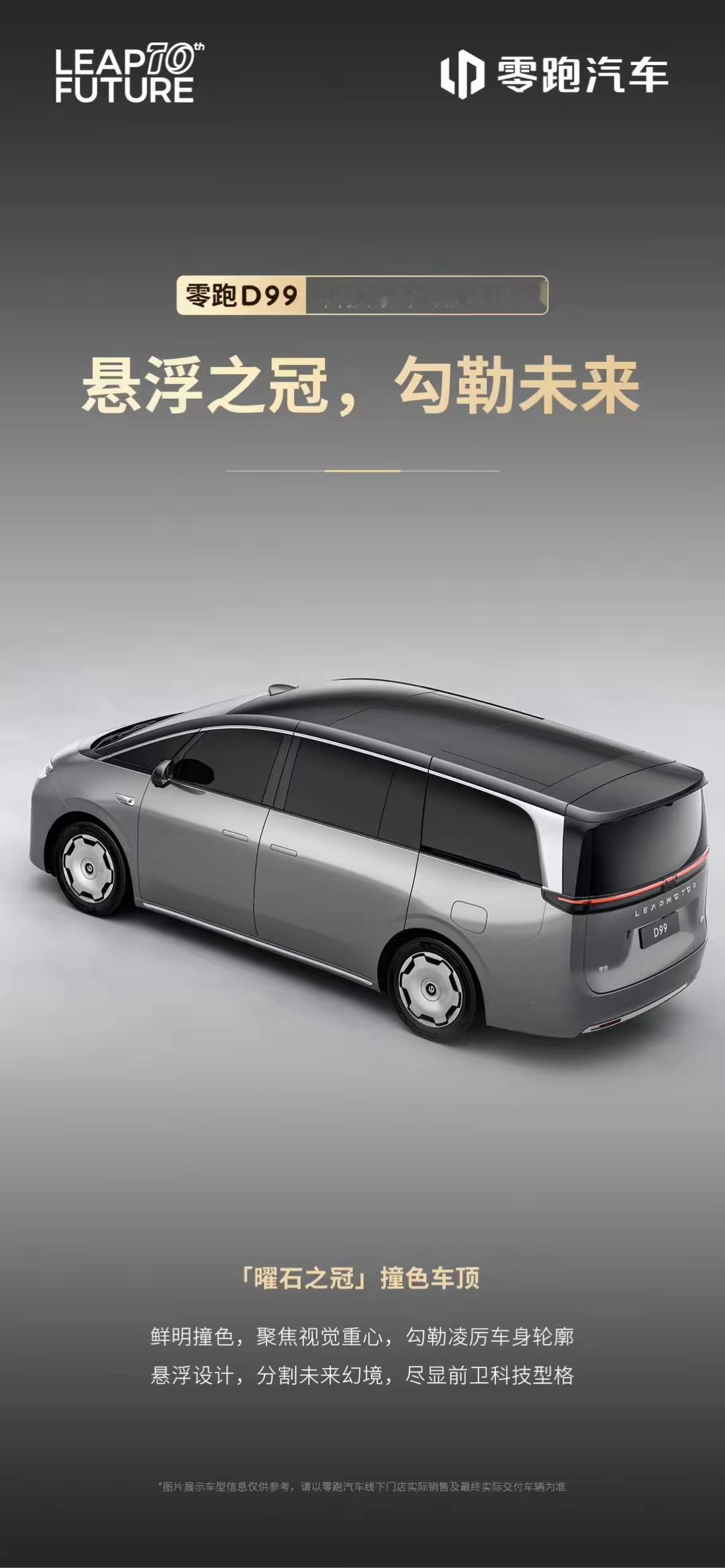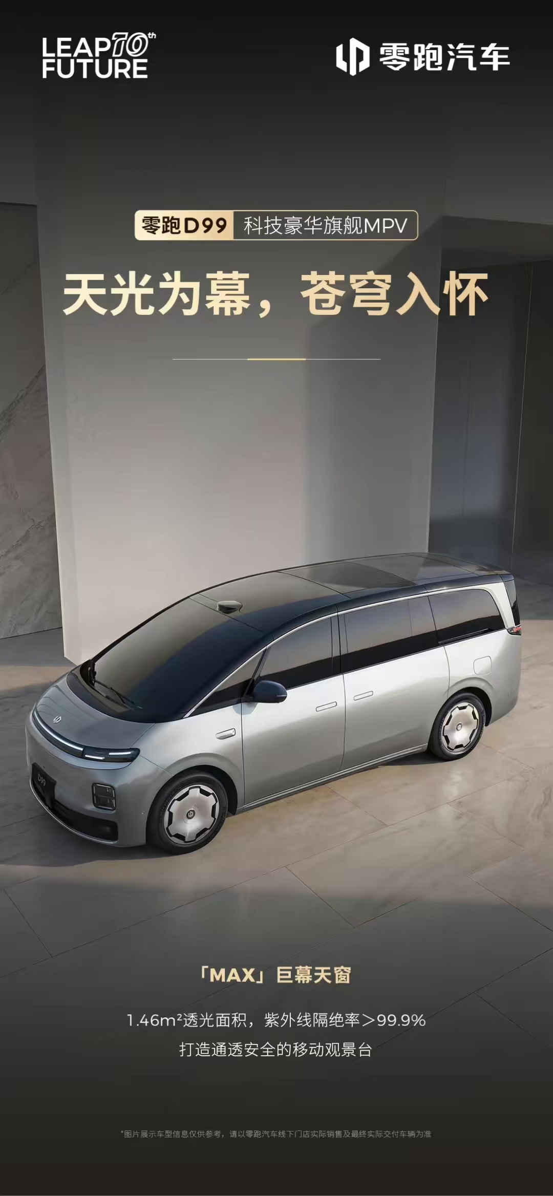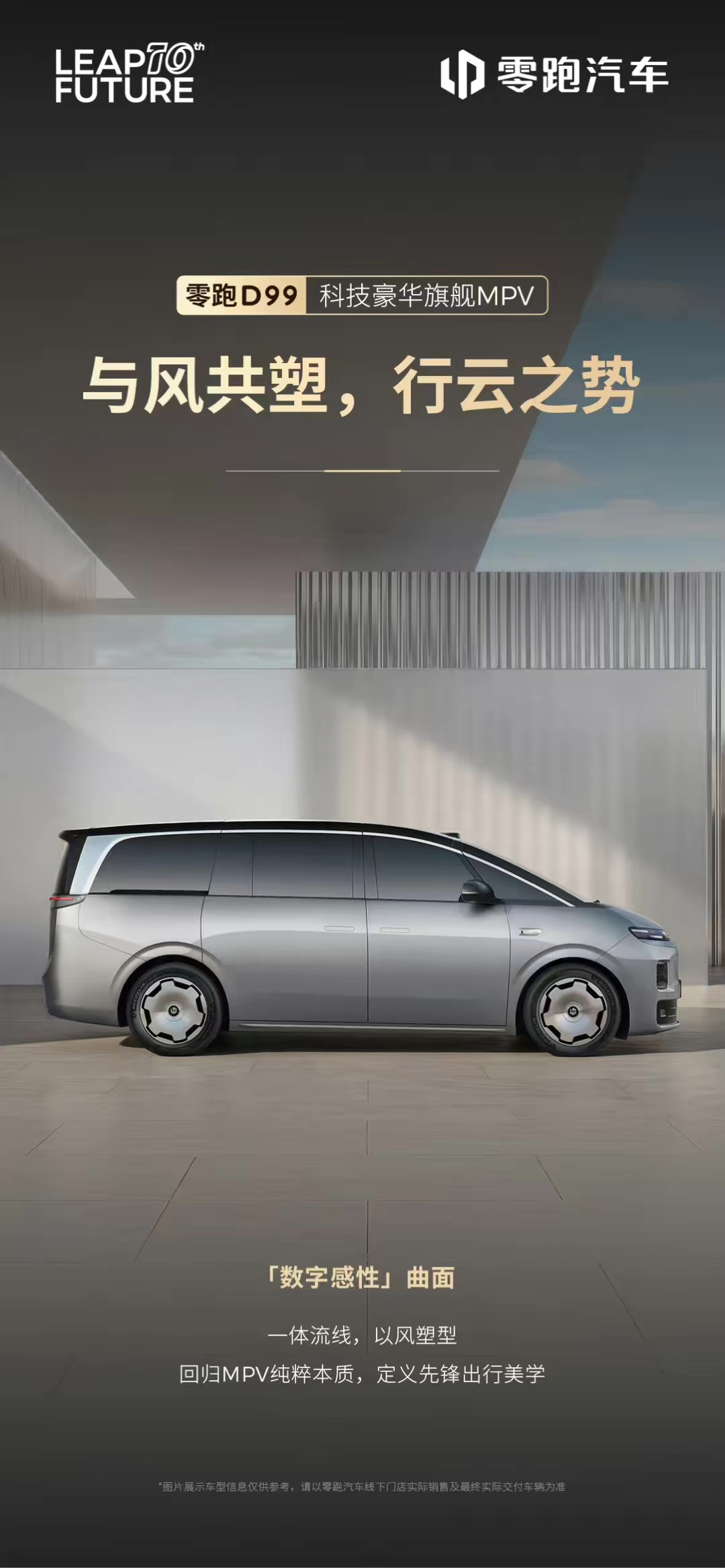 零跑10周年 零居大会 我的零跑生活 零跑终于向 MPV 下手啦,D99 以一种霸气的姿态亮相零跑十周年发布会,六维度全能实力重塑了高端出行体验,十年自研展现的核心优势尽显硬核底气。外观上,5200mm*2000mm*3100mm 宽大车身搭配纯平侧窗、Max 巨幕天窗,19 英寸米其林高性能轮胎与投影大灯+交互尾灯相得益彰,5 种外观选择适配多元审美。续航与三电实力拉满,增程版搭载 80.3 度超大电池,纯电版配备 115 度超级混合电芯及全栈 1000V 三电系统,彻底告别续航焦虑。驾控层面,双腔闭式空悬、连续可变阻尼减震加持,搭配前四活塞卡钳与双轮胎爆胎稳定技术,“凌波微步”模式带来平稳灵动的驾驶感受。舒适性与智能化双线升级,车规级森野氧舱、半苯胺头层真皮搭配真零重力座椅,营造极致奢享座舱;1280Tops 双 8797 芯片赋能,VLA 大模型辅助驾驶与端侧大模型智能座舱,实现全场景智慧交互。安全方面,堡垒笼式车身、十层航天级电池防护,叠加主动 AEB 制动与 AES 紧急避让系统,构建全方位安全屏障。虽然还未全面展示,但现有的信息也给了大家更多遐想,让我们一起期待吧!