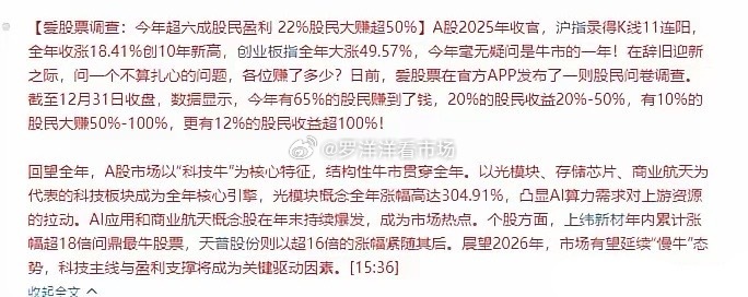 25年60%股民盈利模式,22%股民盈利超50%, 2亿股民朋友你属于哪一档?【爱股票调查:今年超六成股民盈利 22%股民大赚超50%】A股2025年收官,沪指录得K线11连阳,全年收涨18.41%创10年新高,创业板指全年大涨49.57%,今年毫无疑问是牛市的一年!在辞旧迎新之际,问一个不算扎心的问题,各位赚了多少?据调查,截至12月31日收盘,数据显示,今年有65%的股民赚到了钱,20%的股民收益20%-50%,有10%的股民大赚50%-100%,更有12%的股民收益超100%!【A股2025年收官总结:沪指全年收涨超18%创10年新高 创业板指大涨近50%】同时,科创50指数全年涨35.92%,北证50指数全年涨38.8%。纵观全年,算力硬件、有色金属、银行、电池产业链、创新药、商业航天、机器人等多个板块轮动推动沪指一度站上4000点。 数据显示,今年涨幅前三个股分别为上纬新材(1821.41%)、天普股份(1662.49%)回望全年题材方向主要是:A股市场以“科技牛”为核心特征,结构性牛市贯穿全年。以光模块、存储芯片、商业航天为代表的科技板块成为全年核心引擎,光模块概念全年涨幅高达304.91%,凸显AI算力需求对上游资源的拉动。AI应用和商业航天概念股在年末持续爆发,成为市场绝对热点主线。个股方面:涨幅前三的是,上纬新材(1821.41%)、天普股份(1662.49%)、还有就是一个新股年度成交王属于中际旭创!这年指数在3040见底一路高歌猛击越过10年新高4000点半让大家重新喊出了慢牛行情,但是板块与个股走势分化依然严峻,虽然从数据看有少部分股民盈利可观,但是纵观全局还是有很多股民很难,因为目前市场有超过5000只股票,板块几百个洗盘参差不齐,选不对方向即使做时间的朋友也只是让错误越来越大!所以接下来市场大概率继续这类分化结构行情,普涨行情很难持续到来,所以要选对方向,就比如年末的商业航天,选对了怎么做都对✓,反之亦然!一人一句你今年总体数据如何大家晒一下