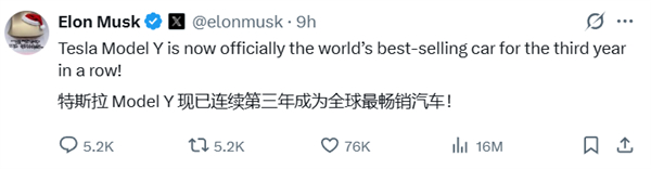 丰田卡罗拉也比不过!马斯克:特斯拉Model Y连续三年成全球最畅销汽车