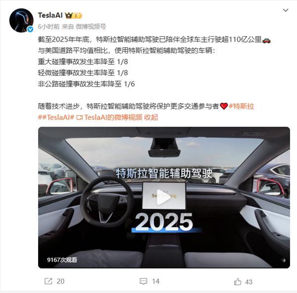 特斯拉辅助驾驶里程超110亿公里:重大碰撞事故发生率降至1/8