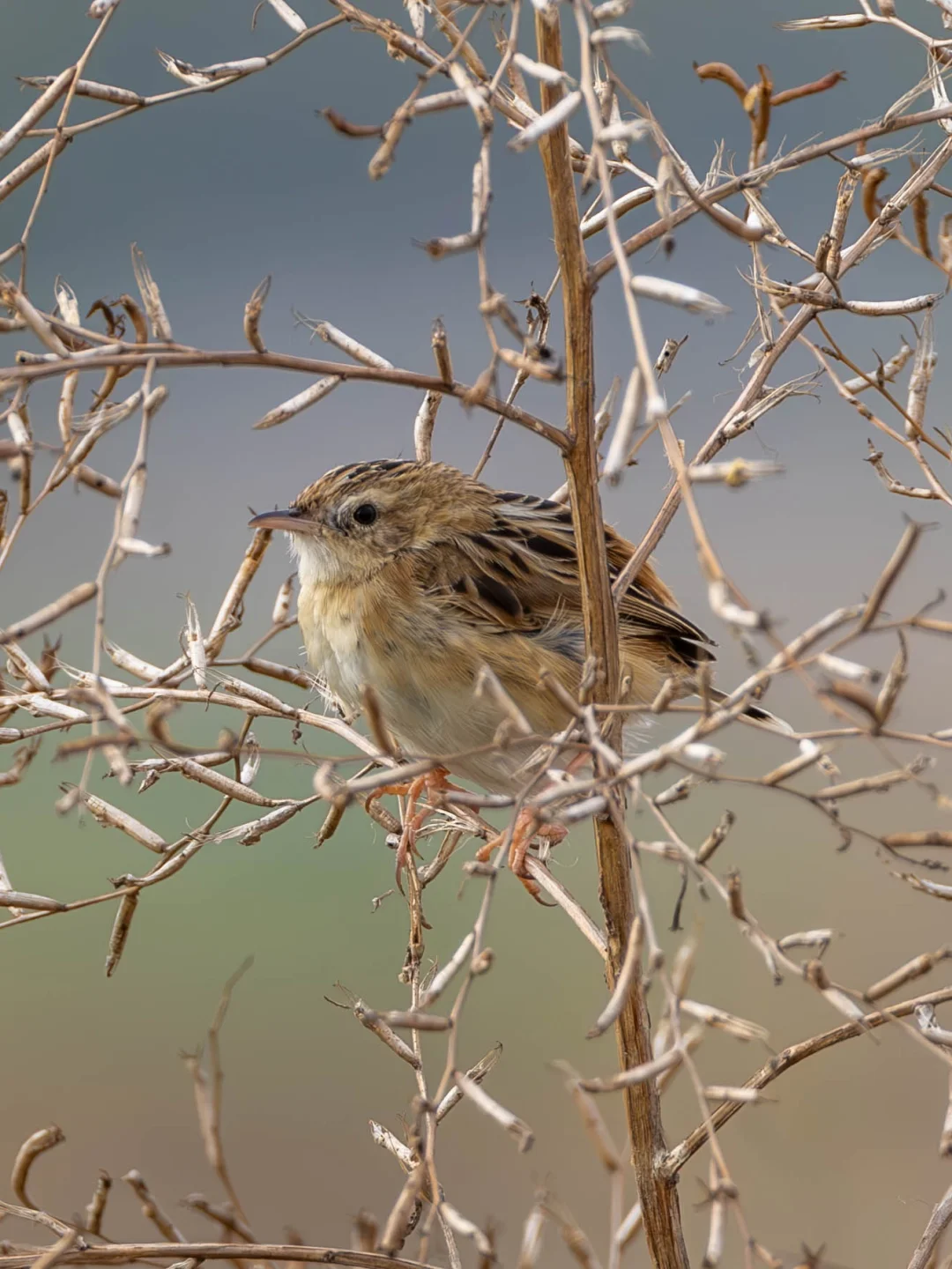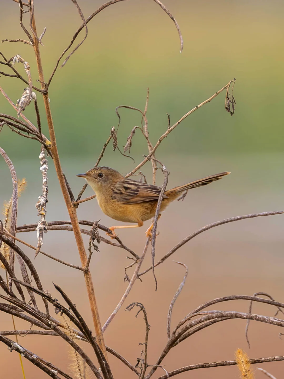 金头扇尾莺在繁殖季节时雄鸟身体有鲜明的金色,头部也是金色的,非常漂亮。然而在这个冬季它就比较黯淡,背面是褐色的,头上也是一些深棕色的条纹,金头一点也不金,简直差评。
