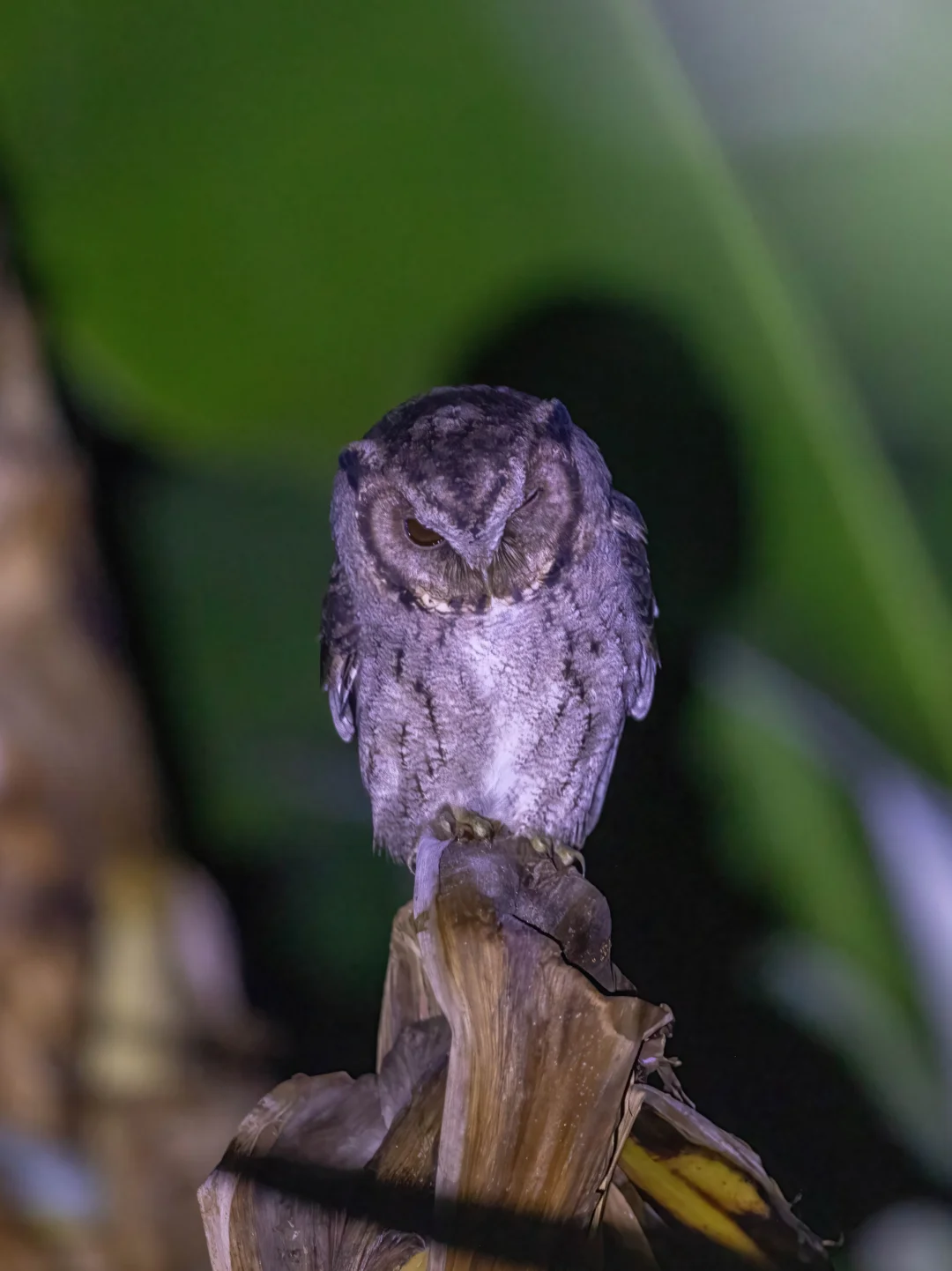 当时快过年,我正驾驶在广西的一片香蕉田间的小路,突然路中间就看到站着一只小领角鸮,我赶紧刹车,小猫头鹰就飞入了旁边的香蕉田里。我于是下车拿热成像仪看了一下,小猫头鹰原来没走远,就站在不远处的香蕉树上,于是干净拍了两张哈哈哈,真是可爱,它好像一副被骚扰的不耐烦啊,睁一只眼闭一只眼。