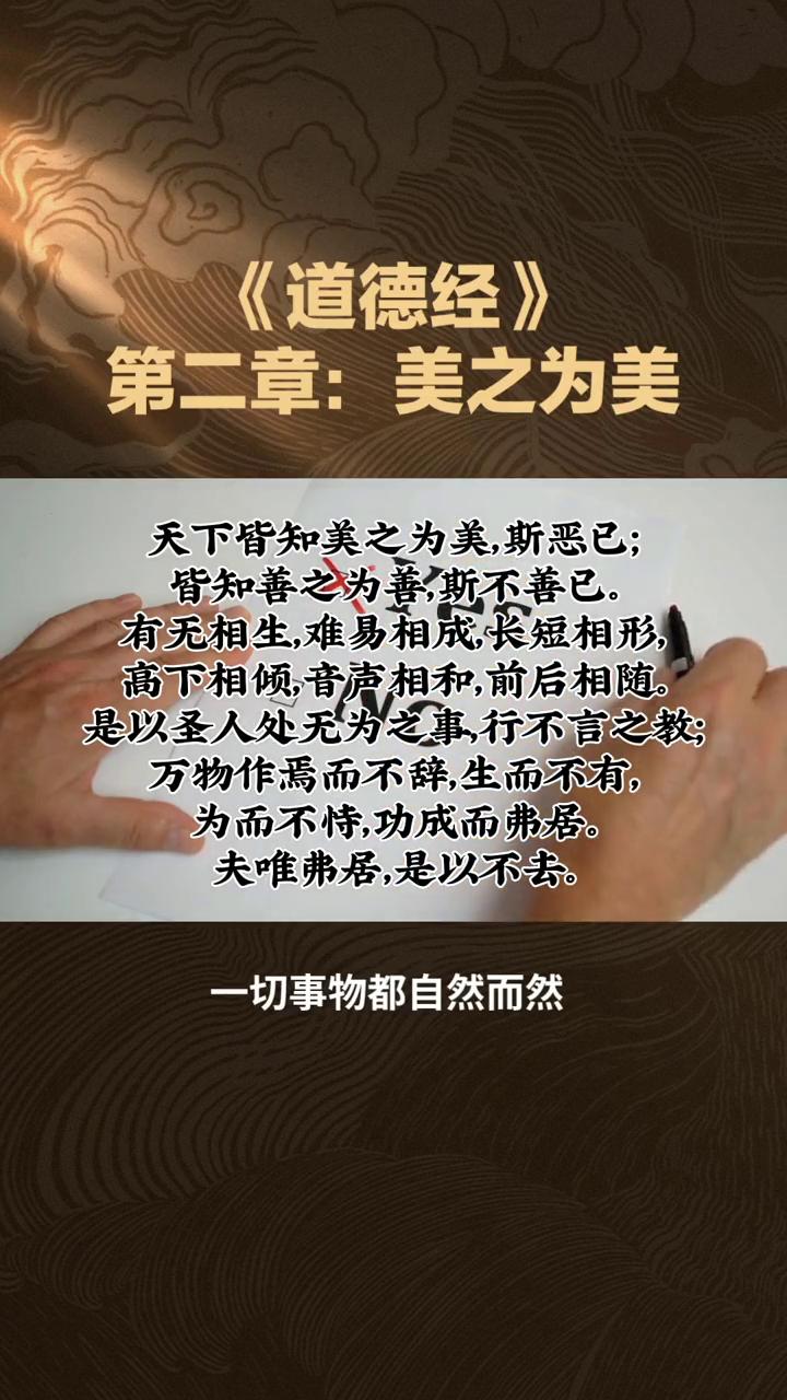 《道德经》第二章:美之为美。 天下皆知美之为美,斯恶已;皆知善之为善,斯不善已。有无相生,难易相成,长短相形,高下相倾,音声相和,前后相随。是以圣人处无为之事,行不言之教;万物作焉而不辞,生而不有,为而不恃,功成而弗居。夫唯弗居,是以不去。 释意:人们都知道美之所以为美,是因为人的主观给事物贴上的标签,结果就同时制造了一种丑恶。同理,人们都知道善之为善的原因,也就离开了真善本身,也是在造恶。所以,有和无互相产生,难和易互相成就,长和短互相比照,高和下互相依存,音和声互相协调,前和后互相连接。 正因为如此,悟道的圣人不以自己的主观认识作为根基,而是以客观真相为基础来做事,以自身跟随大道的无言事实来进行教化。圣人对万物的生发与变化自然地悦纳,而不会人为地拒绝。即使自己按照大道的规律生产了万物,也不会占为己有;自己按照大道有所作为也不会自视为自己的本事,顺应大道而有所贡献也不会居功自傲。 正因为没有了主观上人为的居功,也就没有了"贪天之功"的问题,其功绩才不会消失。这世间的东西都是成对的,一正一反,一阴一阳,有黑有白,有美有丑,有爱有恨,有优秀有落后,有亏有赚,有得意有失意。 可是,世间的人总是将两个结合在一起的东西撕裂开来,人们只想要那个自己喜欢的一面,可不喜欢的一面又给谁?也许,人生的痛苦就缘于此。悟道箴言:有喜欢就必生厌恶,喜欢是短暂的,厌恶是长久的。生活的智慧是选择可选择的,接受那无法选择的。很多人和事总会不期而遇,拒绝越多,痛苦就越多。你所喜欢的往往会毁了你,厌恶的却往往会成就你。若能破除主观上的两极判断,一切事物都自然而然。别太相信自己,懂得协商,吸纳反面意见才更智慧。 对人莫说空话和假话,知行不一必然会出卖自己。学会审听自己所说的话,尽量少说,事实胜于雄辩。有成就莫膨胀,有挫折莫悲伤,成败总是给人考验。