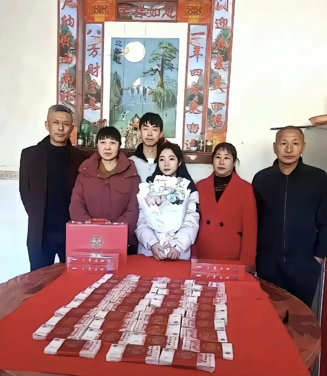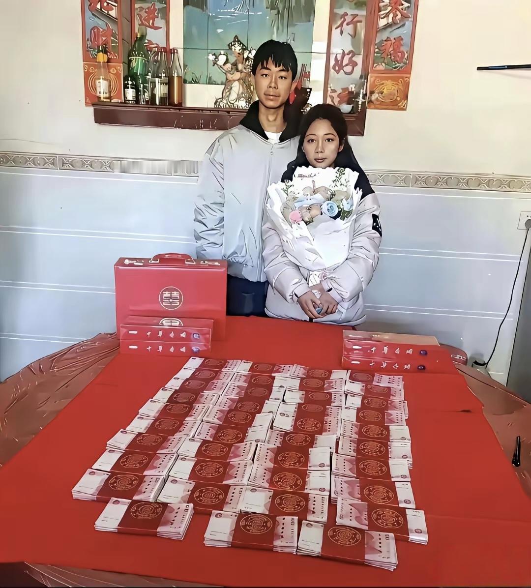 订婚宴成“金钱展”:原本喜庆的日子没有一个人是笑脸! 当订婚桌上铺满成捆现金、礼盒,新人站在钱山旁如同商品展销的“展品”,这场仪式早已偏离了婚姻的本质,沦为一场赤裸裸的金钱博弈。彩礼本是传统婚俗里男方对女方的心意表达,如今却在不少地方异化成“价码比拼”,让婚姻的起点沾满铜臭味。 彩礼的异化,根源在于传统礼俗与功利主义的畸形结合。在部分乡村和县城,彩礼数额成了衡量女方“身价”、男方“实力”的标尺,十万、百万的彩礼数字被当作谈资,甚至出现“无彩礼不结婚”“彩礼低没面子”的畸形观念。这种攀比风下,婚姻不再是两个人的情投意合,而是两个家庭的经济较量——女方父母将彩礼视为“养女补偿”,男方家庭则为凑彩礼背负巨额债务,不少年轻人还没走进婚姻,就先被彩礼压得喘不过气。 更值得警惕的是,彩礼异化还催生了一系列社会问题。因彩礼谈不拢导致的婚约破裂屡见不鲜,部分地区甚至出现“天价彩礼返悔纠纷”“买卖婚姻”等违法行为;而那些为凑彩礼举债的家庭,婚后往往陷入经济困境,为婚姻生活埋下矛盾隐患。更讽刺的是,当订婚宴的焦点全在现金和礼品上,新人的情感被边缘化,这场本该充满温情的仪式,最终变成了一场冰冷的“交易秀”。 婚姻的核心是爱与责任,而非金钱的堆砌。打破彩礼异化的怪圈,既需要年轻人树立正确的婚恋观,拒绝被世俗攀比绑架,也需要社会引导传统礼俗回归本意——让彩礼成为心意的象征,而非婚姻的“入场费”。毕竟,用金钱堆砌的婚姻外壳,永远撑不起长久的幸福。 你觉得这种充满买卖的订婚会不会成为今后幸福生活的绊脚石呢?