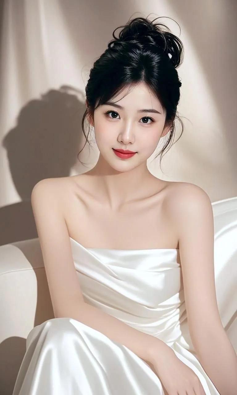 优雅黑发少女,红唇白裙,光影交错,尽显温柔与魅力。