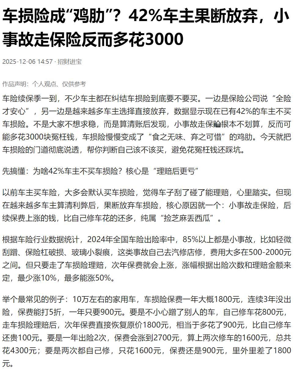不知道国外怎么样,反正中国的车险有点像骗子!每年不出事,它收保费开心的很,但凡你出一次险,他就更高兴了,保费呼呼的涨,本来保险就是出事了拿来救急的,结果呢,大家反而多数选择自已花钱去修!不就是因为你报了保险,来年保费上涨更多吗?咱就说如果这样的设计,它是本着消费者角度考虑的,那真是良心被狗吃了。现在大家教育水平高,知道怎么算账,所以越来越多的人放弃车损险,后面只会更高!我希望保险公司多进来几个国际公司,看看他们到底是一路货色,还是能有稍微为消费者考虑的公司!