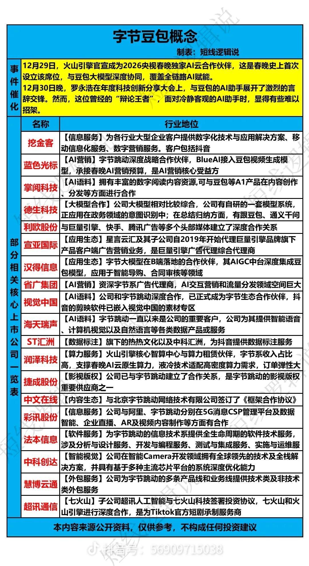 2026年,A股这个板块有望大涨!!! 火山引擎官宣成为2026央视春晚独家AI云合作伙伴,这是春晚史上首次设立该席位,重点关注:蓝色光标、润泽科技、中文在线,相关概念股有望异军突起,让我们拭目以待吧!!!