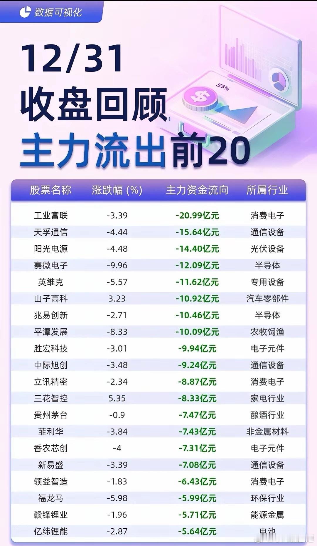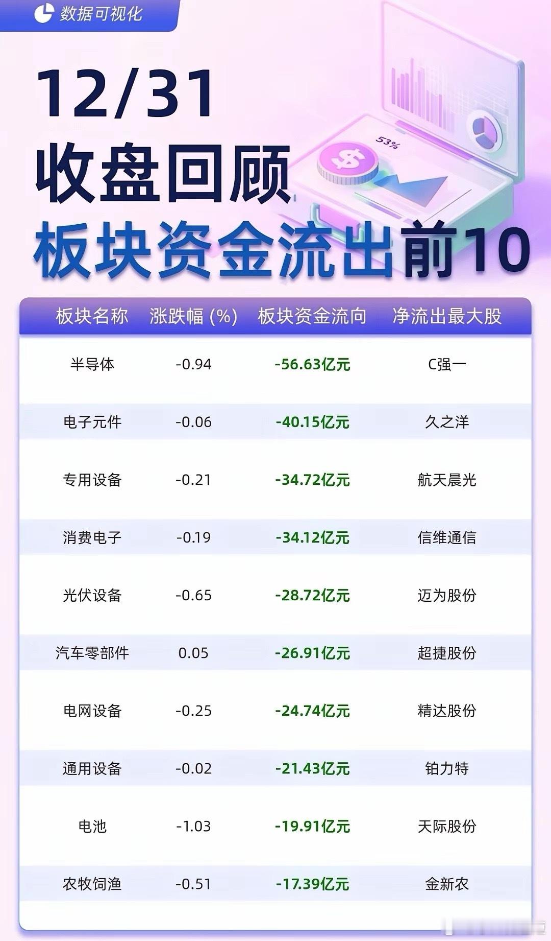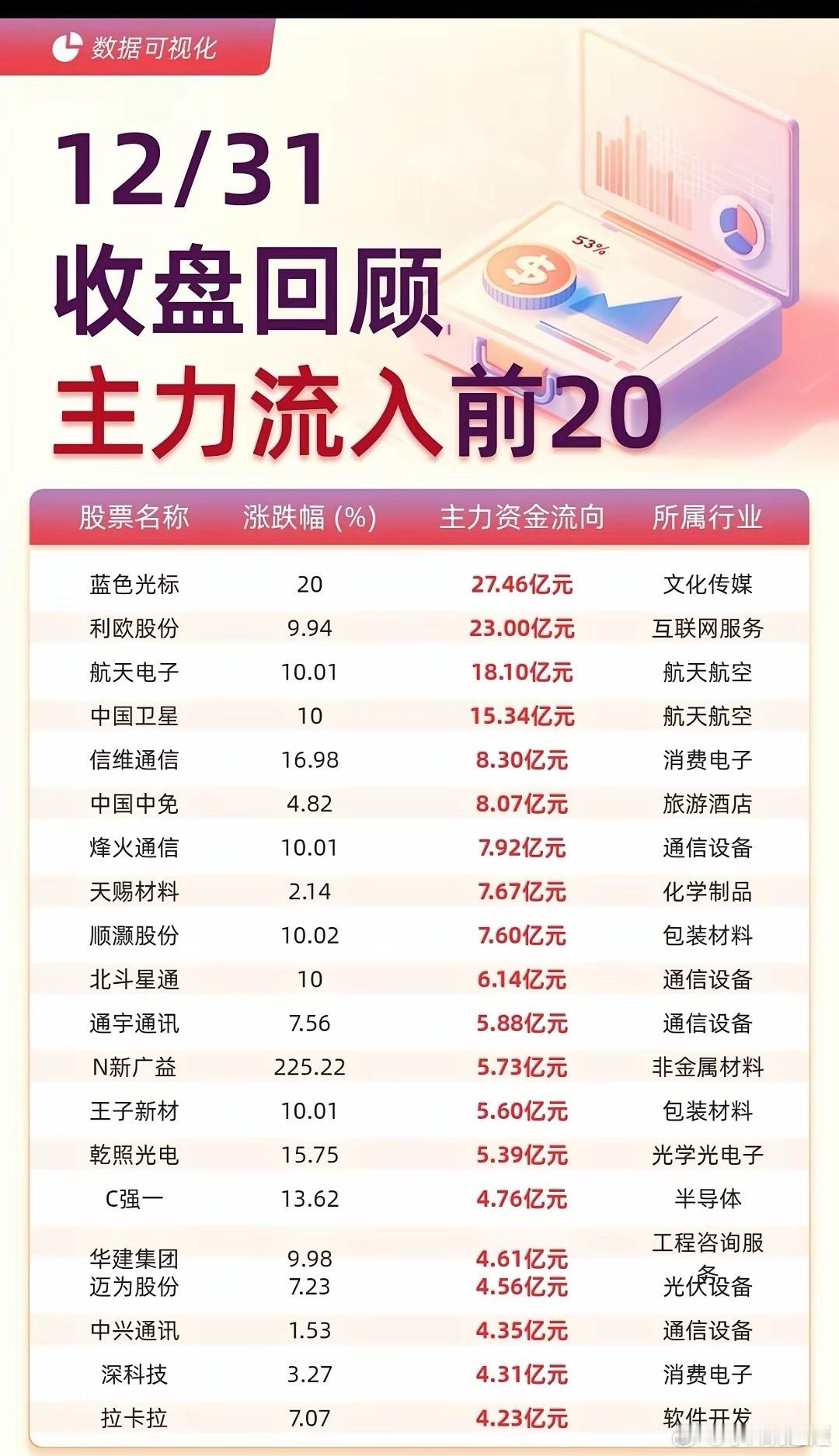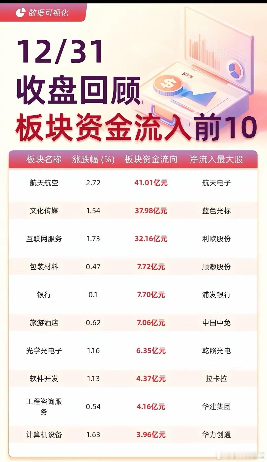 【12/31A股收盘资金全景】年末收官日资金动向出炉!主力流入端,航天航空板块以41.01亿元居首,航天电子、中国卫星等标的获大额资金抢筹。文化传媒、互联网服务紧随其后,蓝色光标、利欧股份分别斩获27.46亿、23亿主力净流入。流出侧则呈现不同格局,半导体板块净流出56.63亿元居首,消费电子、光伏设备等赛道同样遭遇资金撤离,工业富联、阳光电源等龙头股资金流出额居前。年末资金的板块轮动特征显著,航天航空等硬核赛道受追捧,而部分科技制造板块则面临资金兑现,这份资金图谱或为跨年布局提供参考。(数据仅供参考,不构成投资建议)