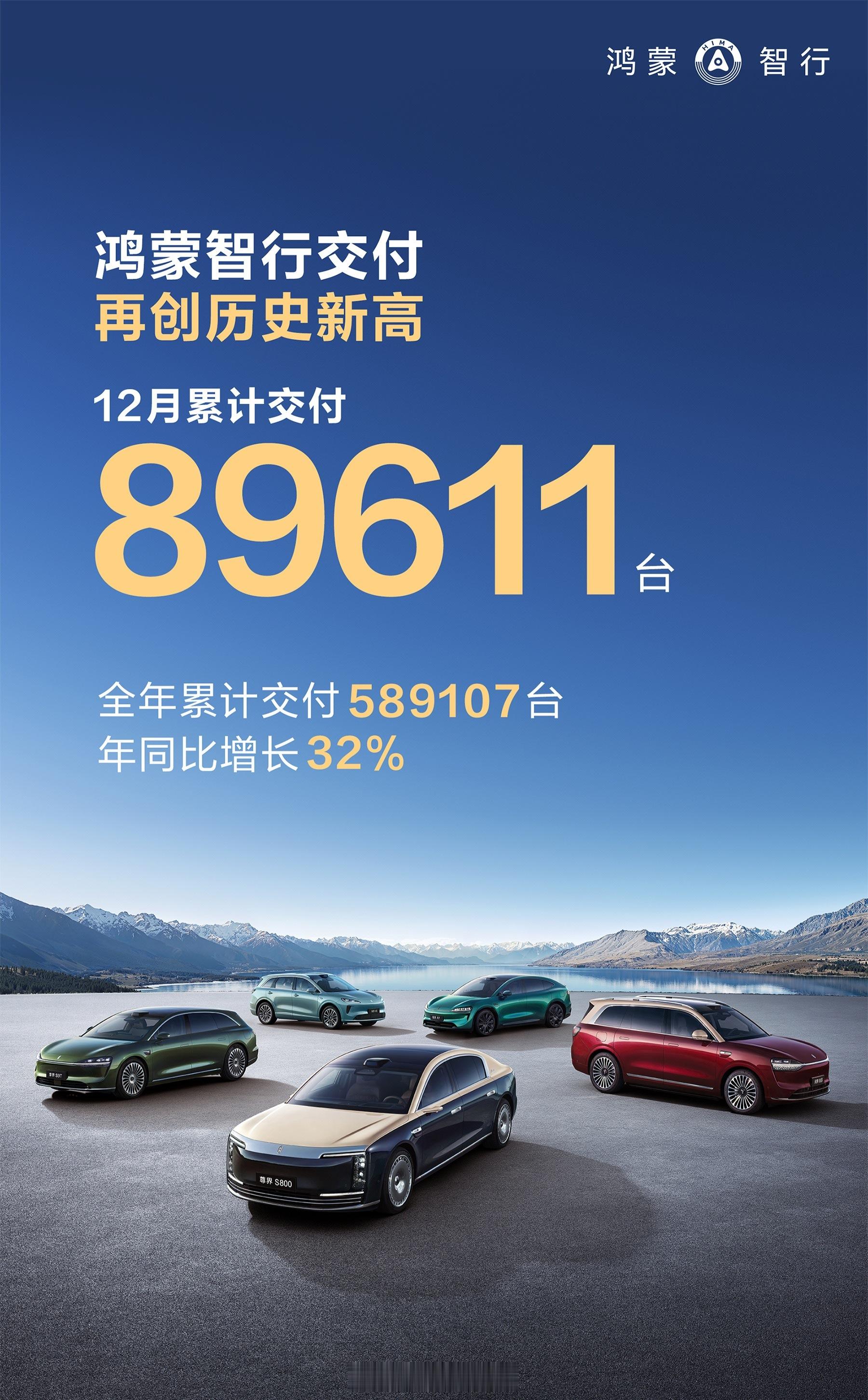 鸿蒙智行年度报告 恭喜鸿蒙智行2025全年累计交付589107台,年同比增长32%;12月单月交付89611台,连续三个月创月度交付历史新高!如果我没记错的话,这个数字应该是中国市场传统豪华品牌巅峰时候的销量了吧?期待2026年鸿蒙智行全系再上另一个台阶,加油干吧💪💪💪💪鸿蒙智行 汽场全开 新能源汽车 与鸿蒙智行共赴新程 在一起鸿蒙智行 智慧出行体验