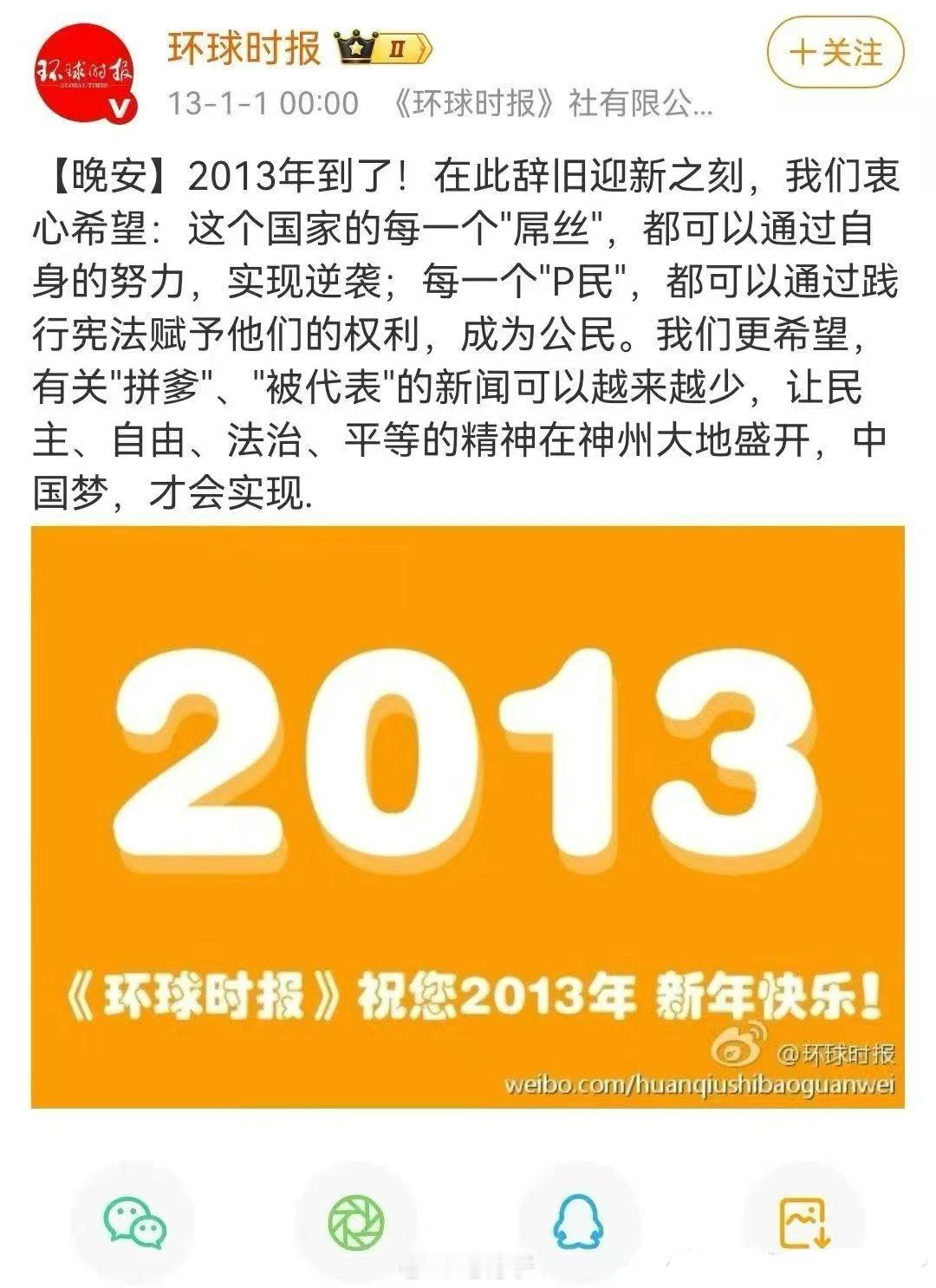 新年贺词真是大开眼界啊!居然还有如此“时尚”的新年贺词,也许这就是所谓的“创新”吧!仔细想了想,2013好像刚好是老壶担任环球时报一把手的时期。专栏 · 奇闻异事奇葩事