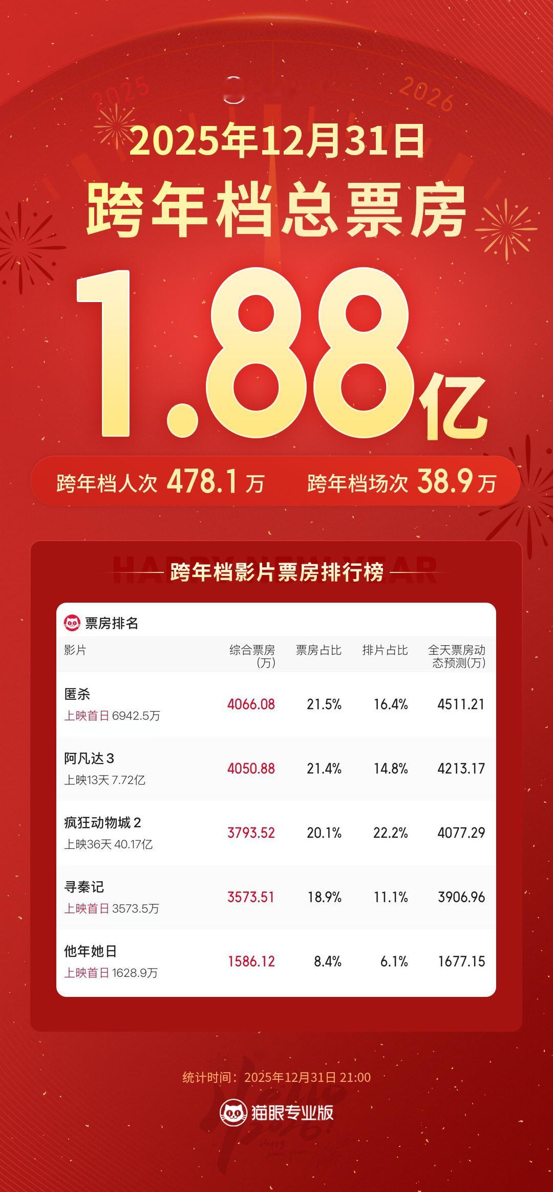 匿杀领跑跨年档票房榜 据猫眼专业版数据,截至12月31日21时, 2025跨年档总票房1.88亿,《匿杀》领跑2025年跨年档票房榜2025跨年档票房TOP5:1、《匿杀》2、《阿凡达3》3、《疯狂动物城2》4、《寻秦记》5、《他年她日》