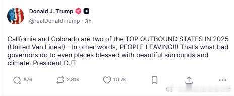 【黄金时代】川普提到加州和科罗拉多人口外流严重,因为激进左翼州长太糟糕川普:加利福尼亚州和科罗拉多州是2025年人口外流最多的两个州(据联合货运公司统计!)——换句话说,人们正在离开!!!这就是糟糕的州长们对那些拥有优美环境和宜人气候的地方造成的后果。DJT总统美国和欧洲当代史川普主义研究热点现场海外新鲜事