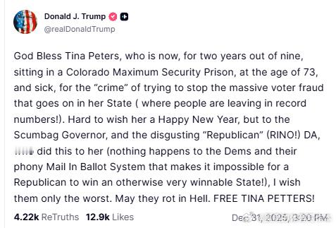 【黄金时代】川普新年再次呼吁,释放因揭露科罗拉多大规模选民舞弊入狱的蒂娜·彼得斯