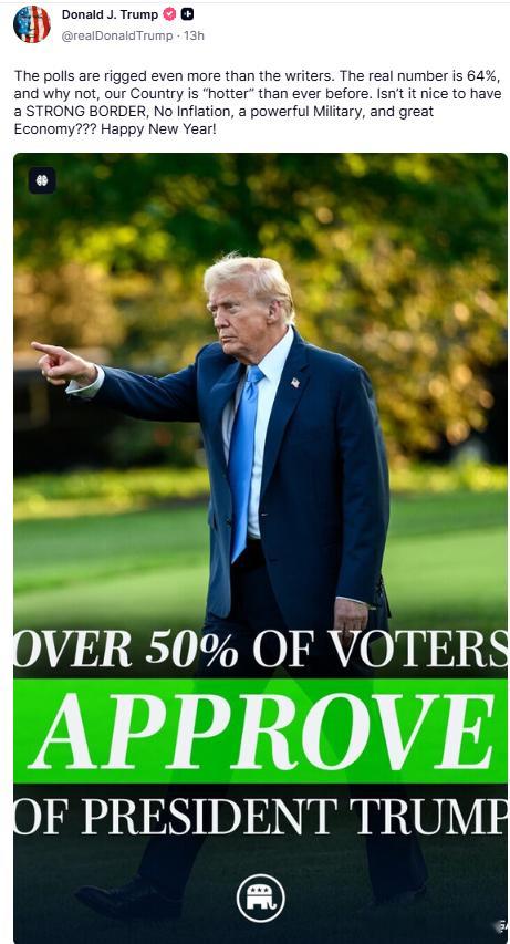 【黄金时代】面对偏左翼民调TRAFAGAR对川普的支持率是50%(已经很高了),川普透露,他的真实支持率是64%川普:民调比编剧们操纵得更厉害。真实数字是64%,这有什么奇怪的呢?我们国家比以往任何时候都“火热”。拥有强大的边境、零通货膨胀、强大的军队和繁荣的经济,难道不好吗?新年快乐!美国和欧洲当代史川普主义研究热点现场海外新鲜事