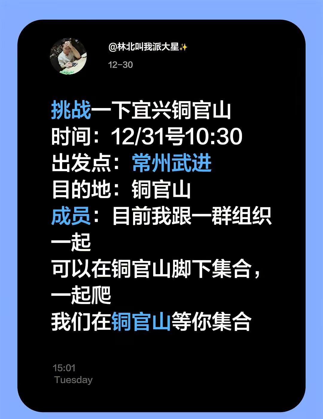 挑战一下宜兴铜官山时间:12/31号10:30出发点:常州武进目的地:铜官山成员:目前我跟一群组织一起可以在铜官山脚下集合,一起爬我们在铜官山等你集合铜官山 找搭子爬山 爬山搭子哪里找 铜官山