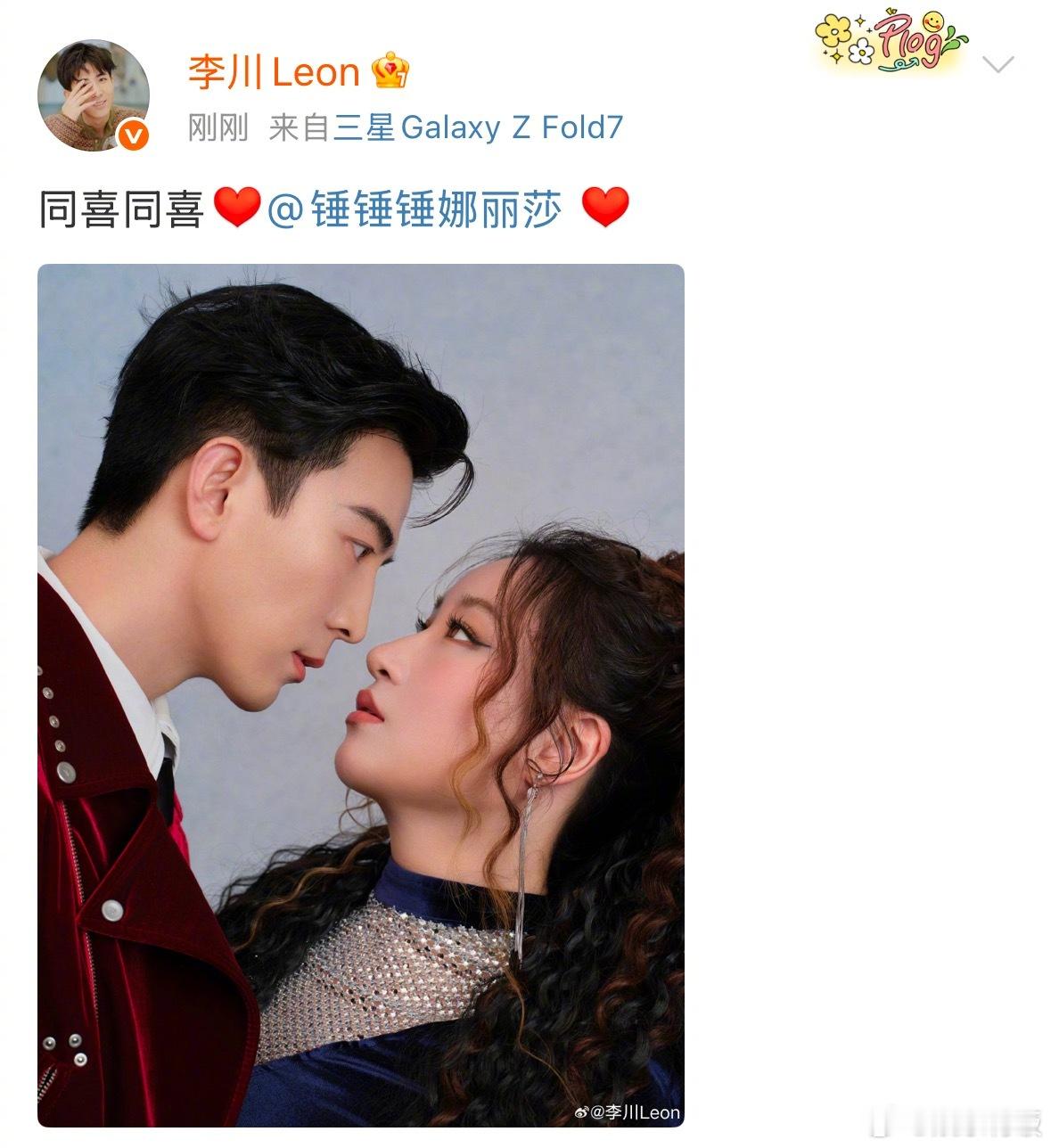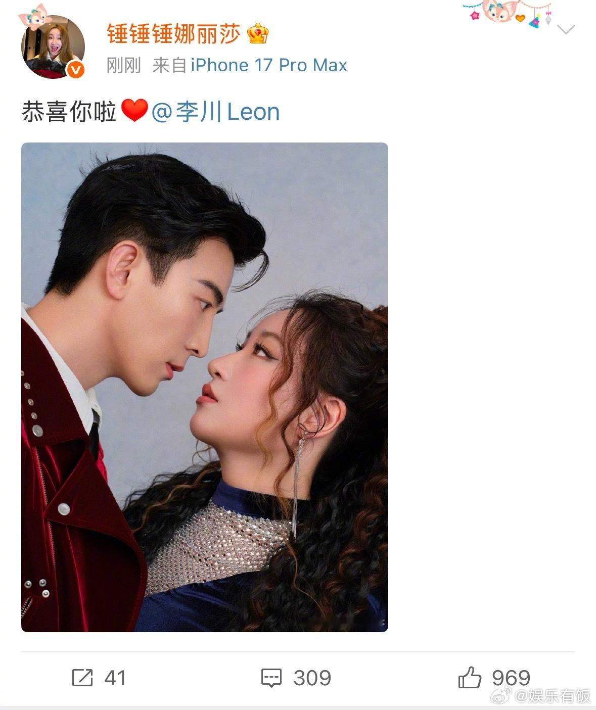 锤娜丽莎恭喜李川求婚 后二人发博晒出对视合照,一定要一直幸福下去