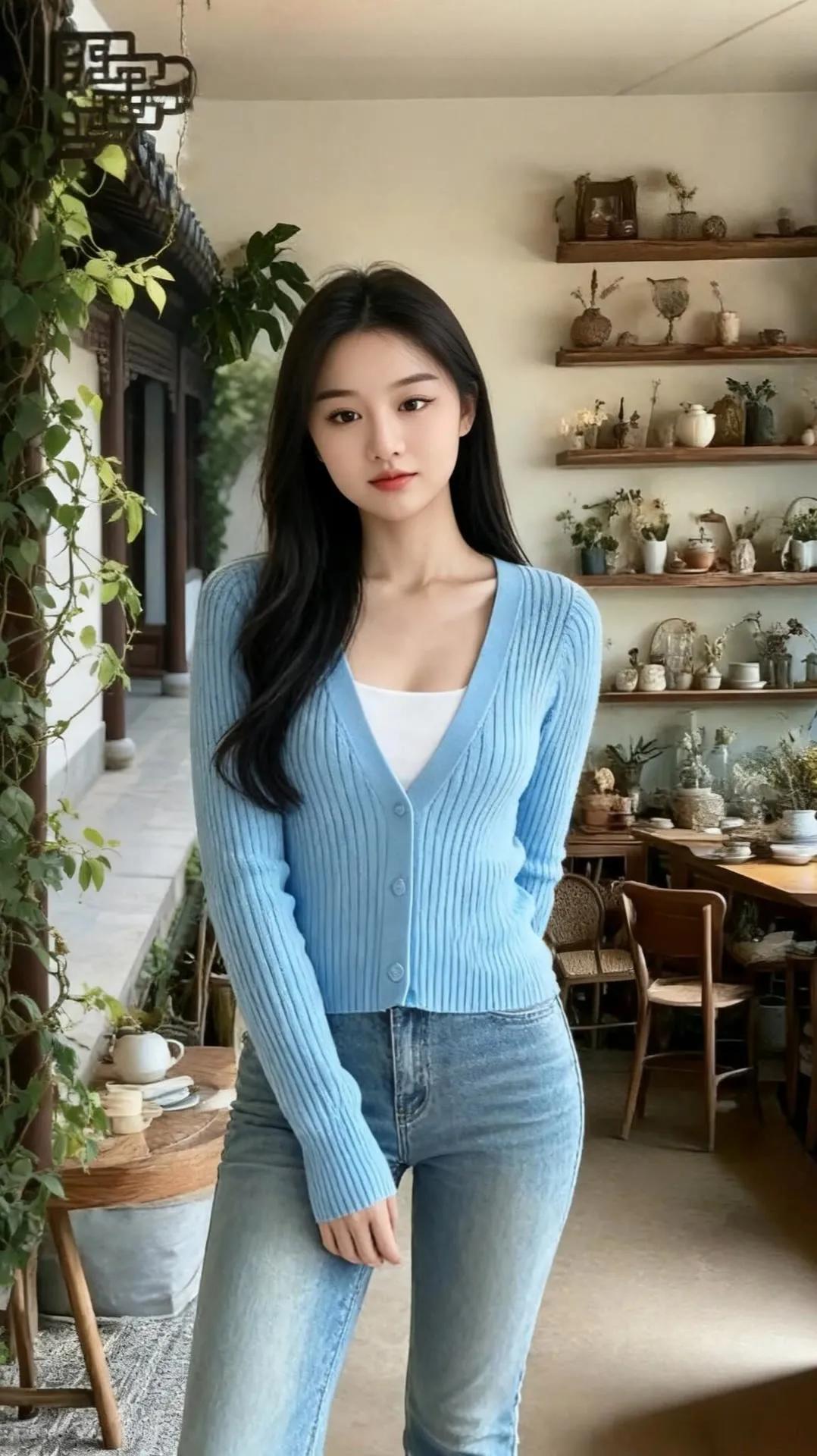 温柔蓝调,复古咖啡馆的清新穿搭祝粉丝们2026年元旦快乐