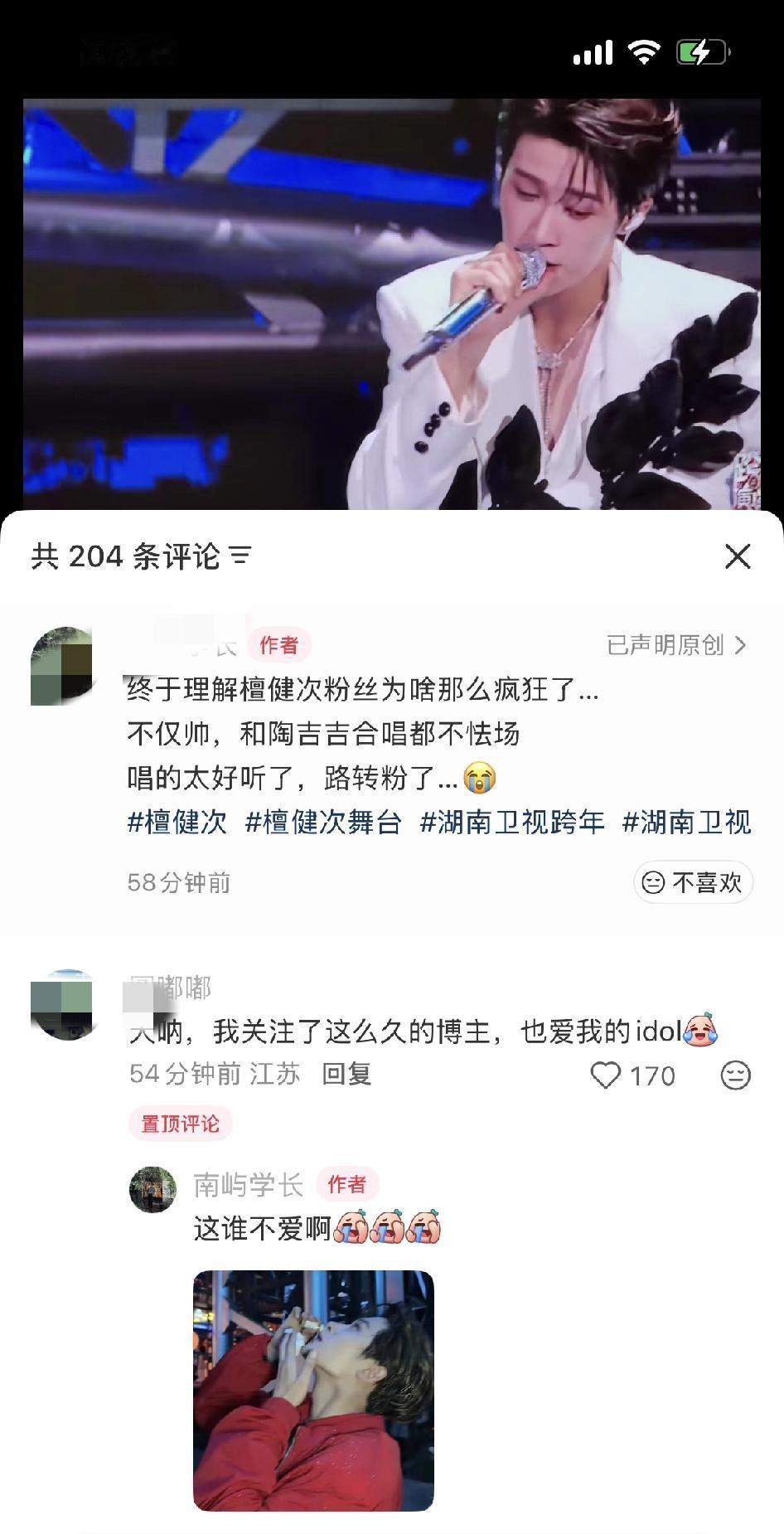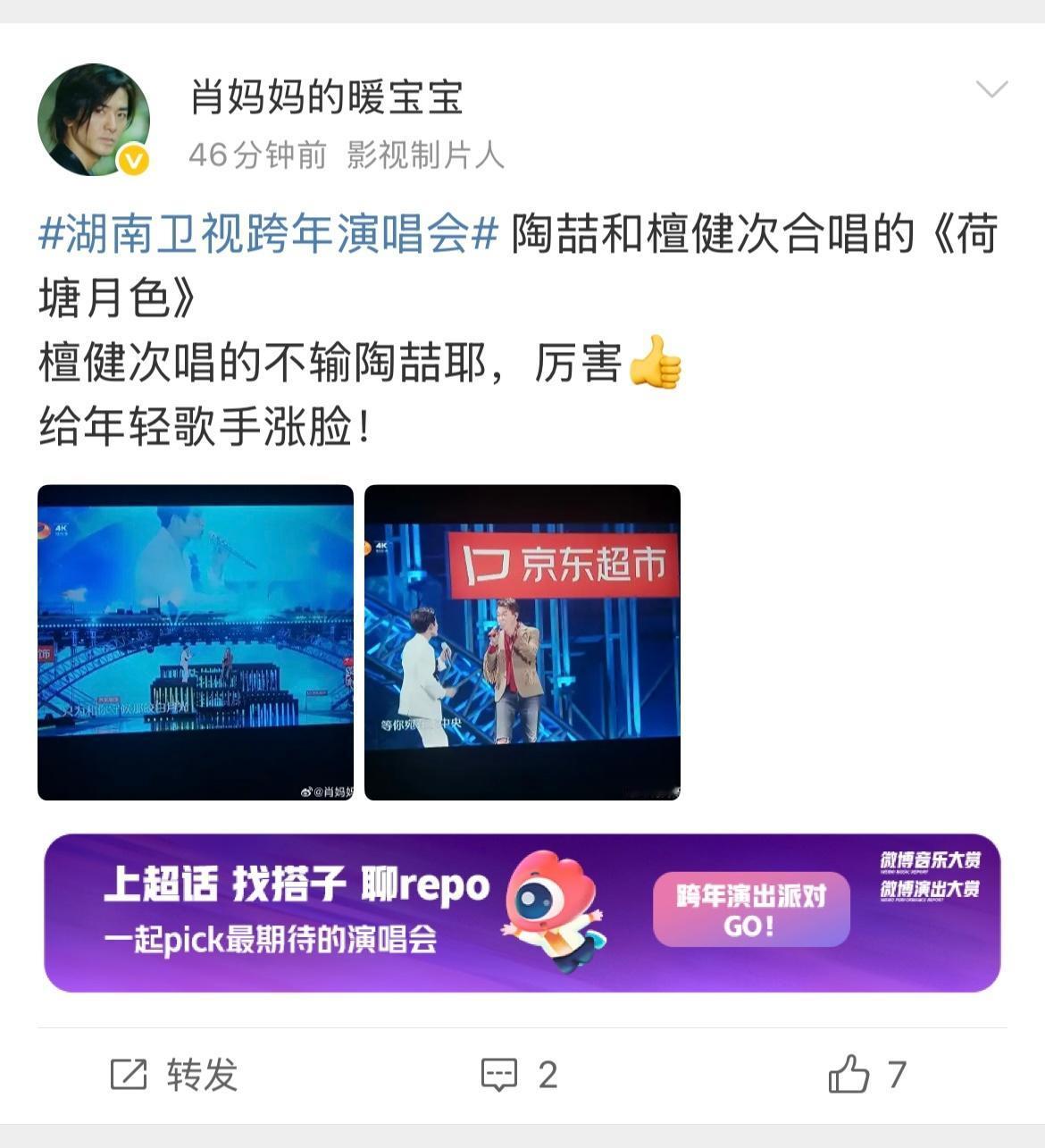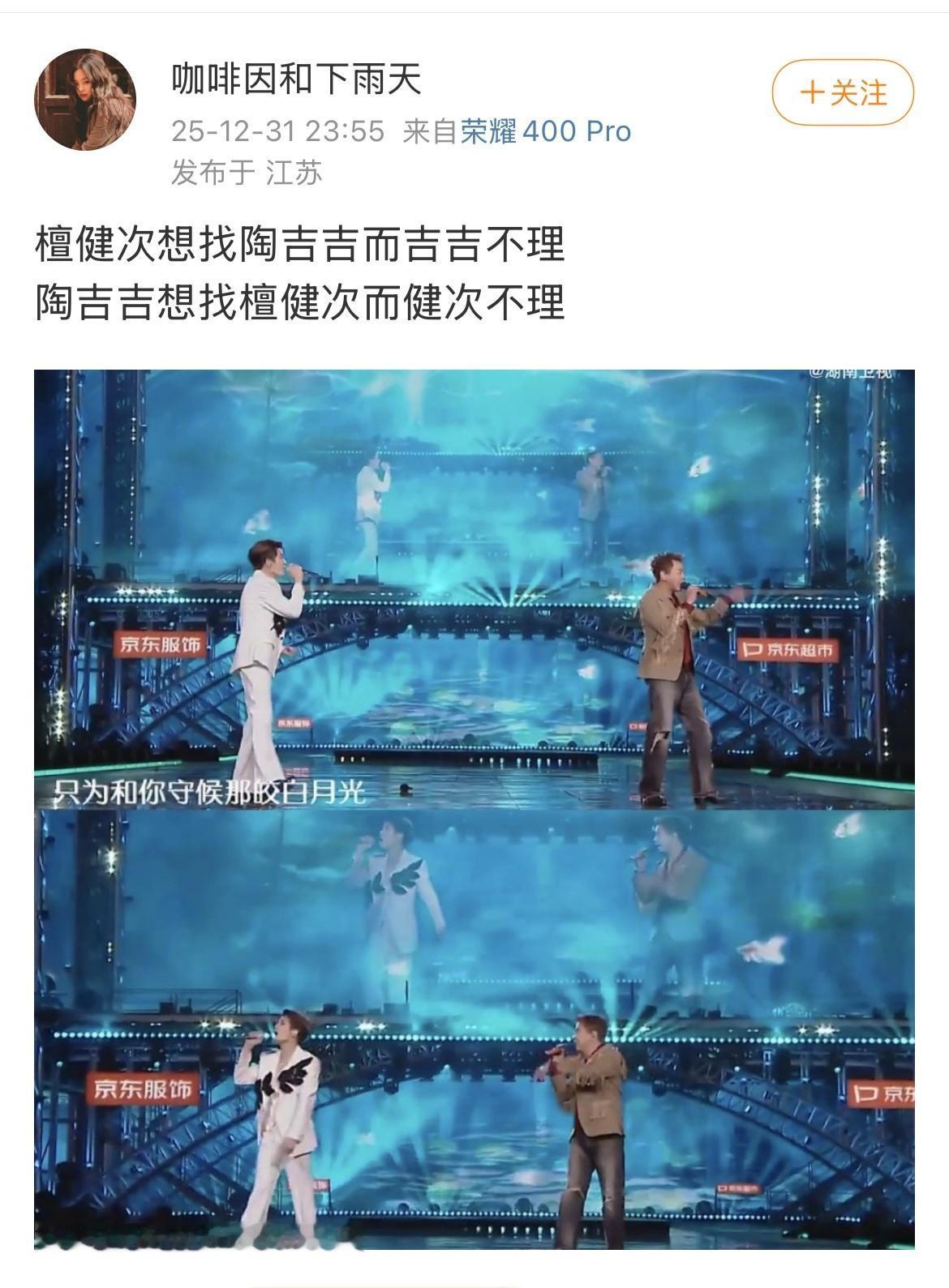今年跨年晚会最佳创意改编作品《荷塘月色》!湖南卫视檀健次和陶喆唱的《荷塘月色》绝对全开麦了,檀健次能跟得上陶喆的怪叫唱法,音都跑到山路十八弯了,听了感觉这鱼儿也不知道弯弯绕绕地游到哪儿了!鱼儿已经晕水了,转不回家去了!没有一条鱼来这个荷塘逛一圈还能走直线! 哈哈哈哈哈笑死了,这唱的山路十八弯的,下次合作俩人能唱的跟这次一模一样吗?真正的高手合作就是爽!不一样的风格,同样的好听,檀健次音色我喜欢,清亮清亮的! 最佩服檀健次竟然能跟陶喆合唱,并且还能能跟上陶喆的歪七扭八的调调!之前大家还在猜陶喆会不会让檀健次哭!结果檀健次稳定发挥了!檀健次太牛了,就像吞了CD一样,不仅这次混响且音准惊人,这实力太强了! 檀健次真是什么风格什么音色都能唱,而且特别特别特别会合唱!感觉陶喆在肆意的到处游走,檀健次在后面一直在兜底的感觉。听多了知道他两要在哪里转音了,但我保证他两唱不出第二个一模一样的版本! 哪个天才想出来让他们俩搭的!如此奇妙的化学反应!好新鲜的改编,合作无间,实力唱将毋庸置疑! 哈哈哈哈哈陶喆:游~游~游~游~过了四季 荷花依然香 。檀健次:(蓝牙连接成功)嚯~嚯~嚯~嚯~ 全程听完满脑子都是哦耶耶耶耶~哦哦哦~耶耶耶耶耶~耶!耶!耶!哒哒哒哒哒~哒哒哒哒~ 嗯耶~ 在~你的荷!塘~ 哦~耶!水中~漾~!哦~耶! 檀健次绝对实力唱将,新版难唱度特别高,檀健次r&b现场竟然这么稳,气息平稳, 肺活量贼好,咬字清晰,转场气压真的超绝了好高,专修音响! 这首歌的风格和他个人solo的《DEAD REFLEX》风格迥异,檀健次技术和唱商绝对是的!关键是他还在流感中,一点都听不出在生病! 别有一番风味的荷塘月色,檀健次和陶喆的组合意外惊喜的好听!