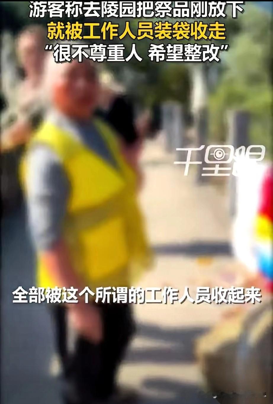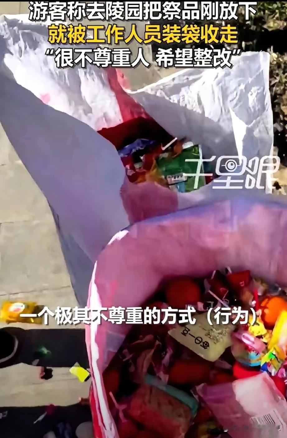 云南保山一男子在烈士陵园祭拜先烈,放下祭品后转身离开,没想到转身就被工作人员将祭品倒入麻袋。 男子认为不被尊重了,他说:“我来祭拜先烈,放下祭品后,人都还未离开,祭品就被当面收走,是不是有点太伤人心了?工作人员却说这是公司规定的。 祭品是来表达对先烈的敬意,心意还没尽,就被这样处理掉,实在是心里很不舒服。”工作人员这么做也有他的道理,“我们这么做是为了保持卫生。倒掉是为了防止老鼠啃咬那些没有人处理的祭品。” 也有人说可以用其他方式处理掉嘛,这样处理掉伤人心。