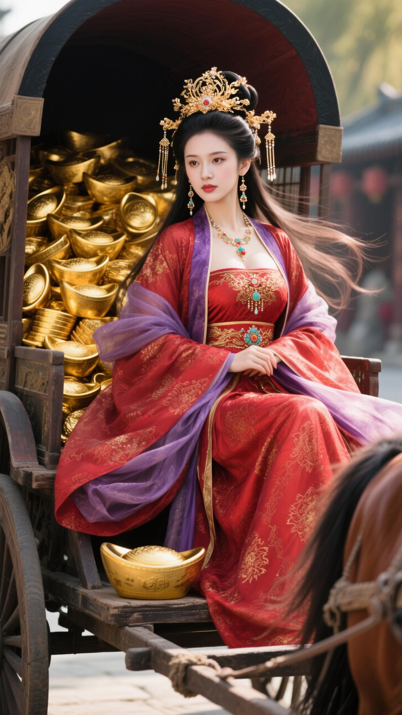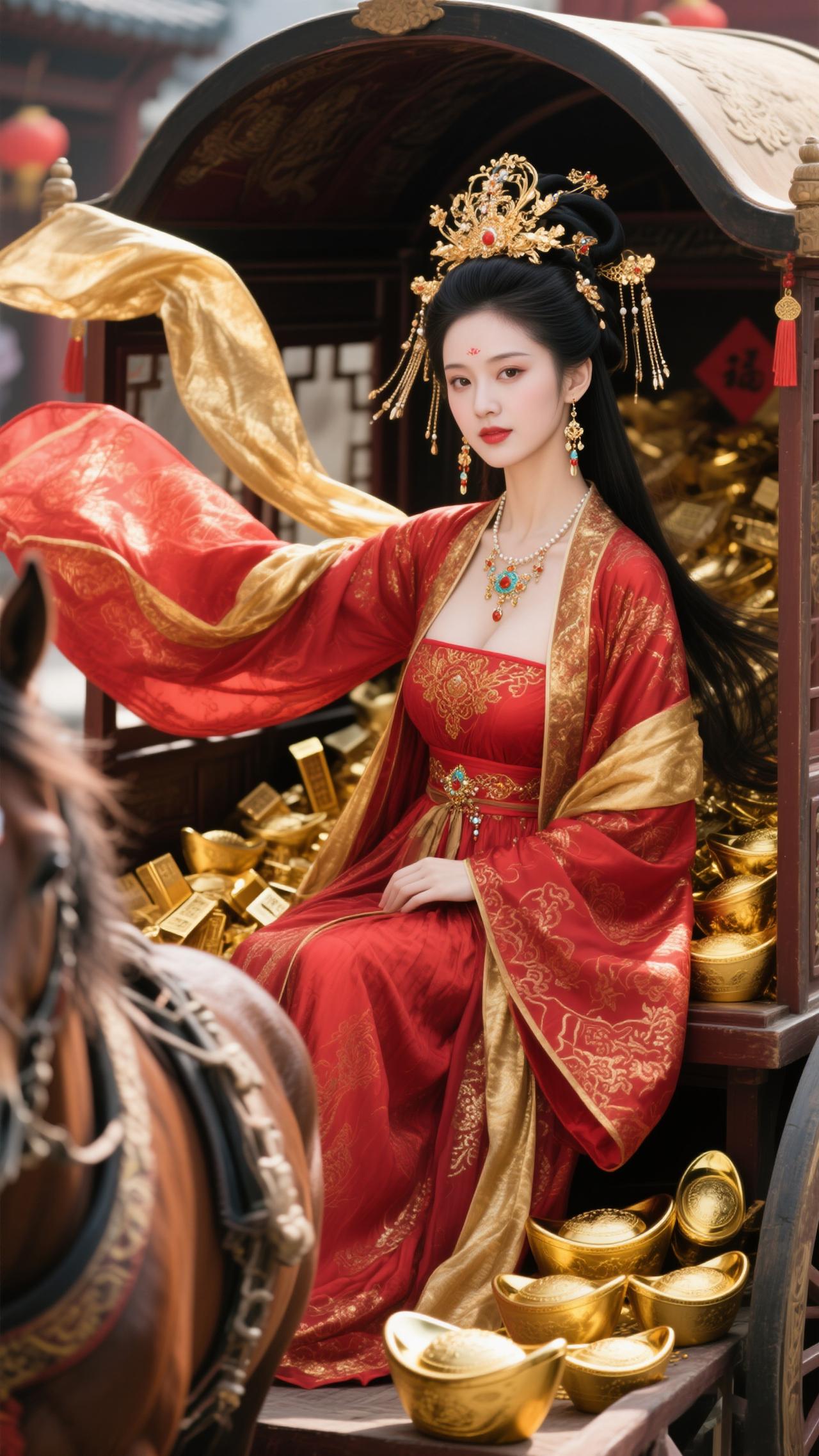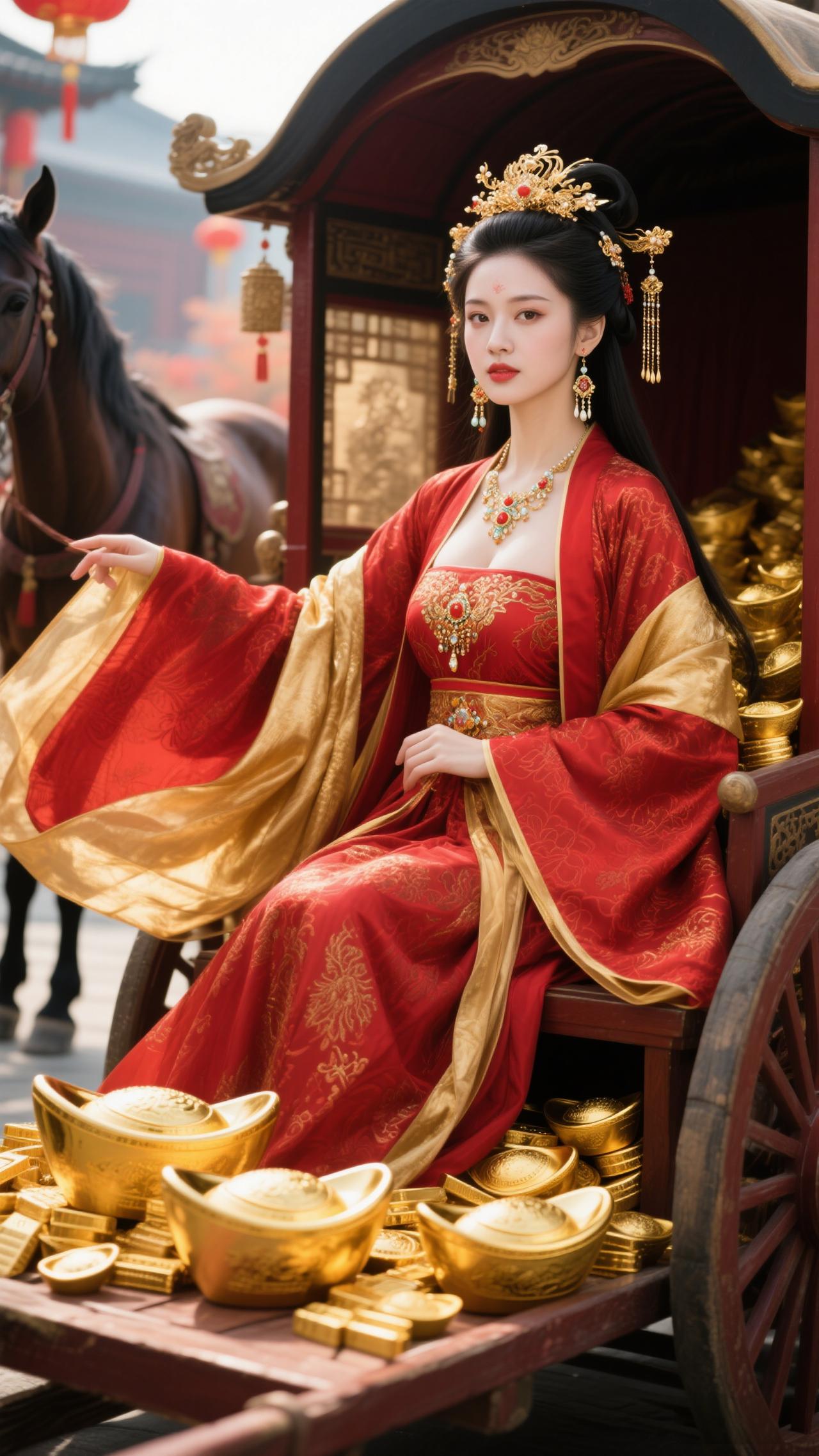 红袂金冠耀目,雕车满载金锭。 金马踏春驰吉路,福韵盈门照锦程,财如江海腾。 笑指金舆凝瑞,风扬紫袖飞琼。 2026马年至,愿君财禄两相生,岁岁福常萦。