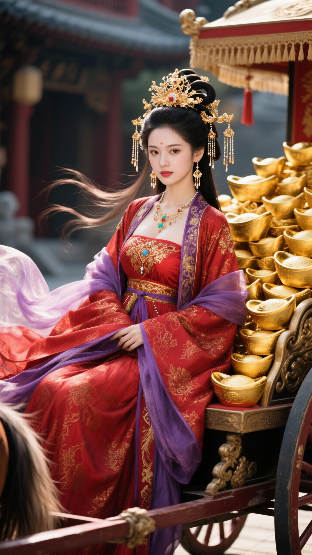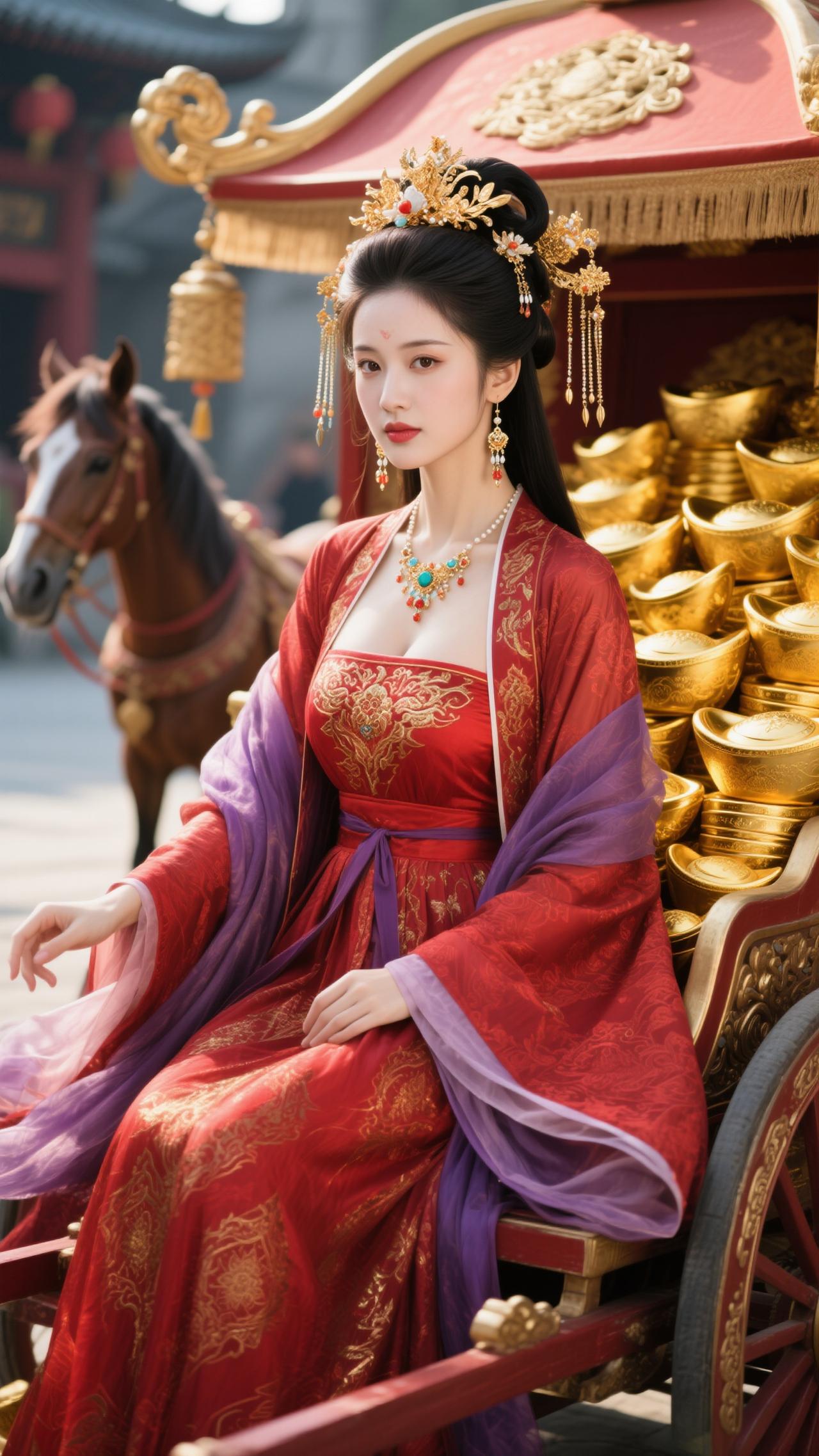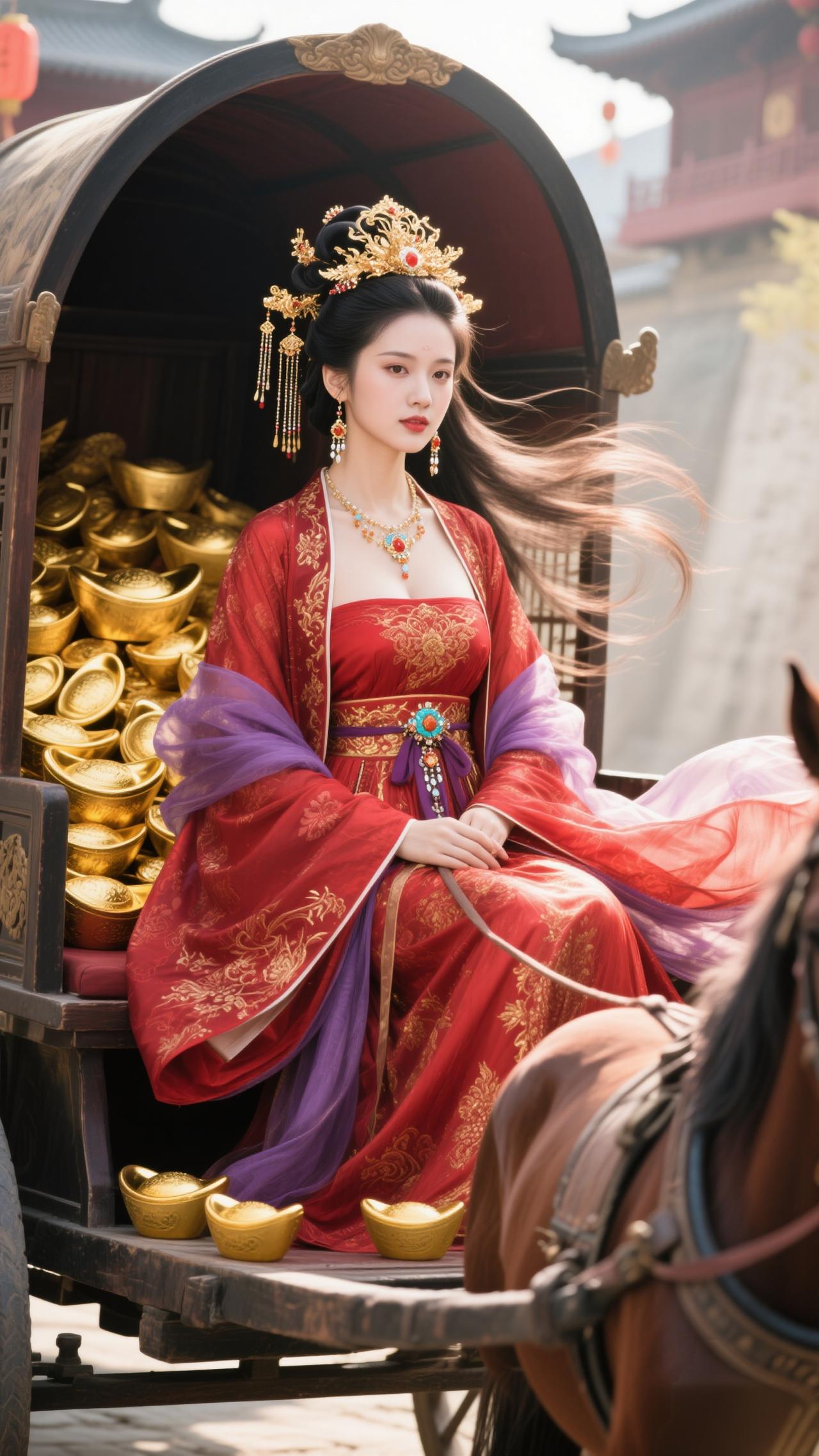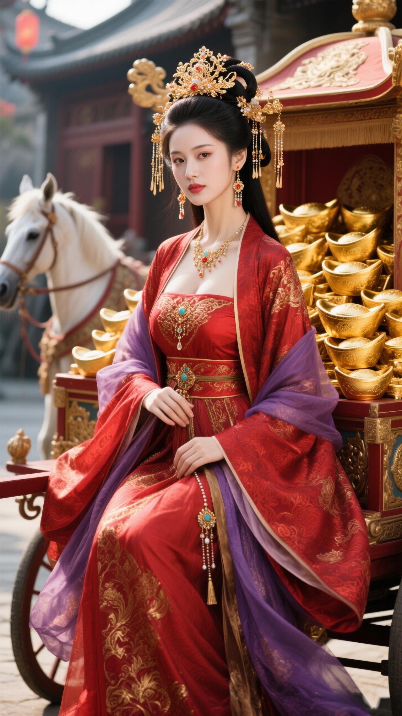 红袂金冠耀目,雕车满载金锭。 金马踏春驰吉路,福韵盈门照锦程,财如江海腾。 笑指金舆凝瑞,风扬紫袖飞琼。 2026马年至,愿君财禄两相生,岁岁福常萦。
