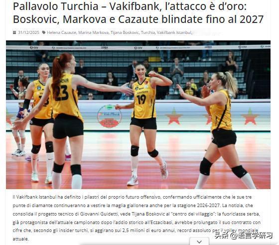 年薪 250 万欧元:博斯科维奇,世界身价最高的球员 朱婷、袁心玥前土超东家瓦基弗银行大动作– 意媒:进攻阵容耀眼:博斯科维奇、马尔科娃和卡绍特合同锁定至 2027 年。 伊斯坦布尔瓦基弗银行确定了未来进攻阵容的支柱,正式确认其三位王牌球员将在 2026-27 赛季继续身披黄黑球衣。 这一消息巩固了主教练意大利人乔瓦尼·古德蒂的技术计划,其中接应塞尔维亚人蒂亚娜·博斯科维奇成为"村姑中心"的焦点:这位塞尔维亚超级球星在当前赛季继历史性告别伊萨奇巴希后继续引领球队,据土耳其内部人士透露,她的合同续签金额约为每年 250 万欧元,创下了现今世界排球的绝对纪录。 与她一同,俱乐部还锁定了俄罗斯球员主攻玛丽娜·马尔科娃和法国球员主攻海伦娜·卡绍特,两人都是球队攻防阵容的重要棋子。她们的续约为瓦基弗银行带来了欧洲顶级俱乐部中罕见的稳定性。在这三颗明星球员之外,阵容还因美国副攻奇亚卡·奥格博古的回归以及本土副攻泽赫拉·居内什的续约而完整,她的预计薪资为 125 万欧元。 来源:电子排球杂志