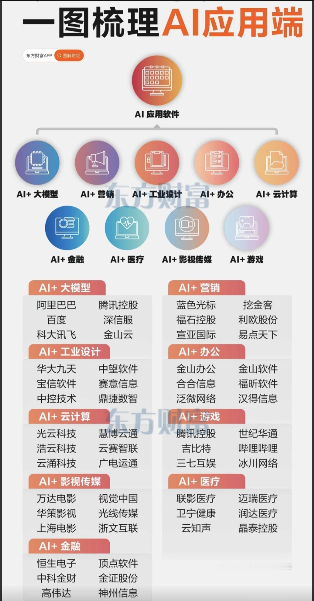 全景图解析:AI应用端! 大模型AI,AI金融,AI医疗,AI教育,AI游戏,相关核心龙头股: