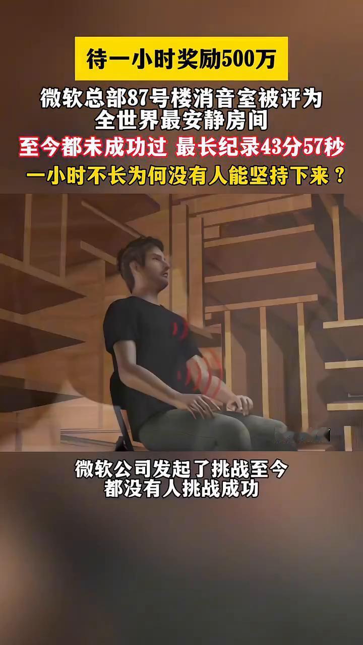 待一小时奖励500万。 微软总部87号楼消音室被评为全世界最安静房间,至今都未成功过,最长纪录43分57秒。一小时不长为何没有人能坚持下来?人类在0dB的环境下听不到声音,人工制造的最安静的环境纪录是-13dB。微软利用吸音材料吸附了各种频率的声音,你甚至会感觉到地球都停止了运动,可以听见心跳的声音。 微软公司发起了挑战至今都没有人挑战成功,一小时很短为何没有人能坚持?