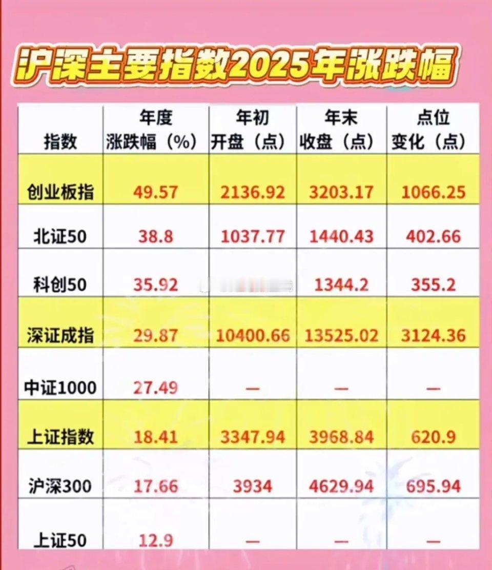 沪深主要指数:2025年涨幅汇总!第一名:创业板指数涨幅最高49.57%第二名:北证50涨幅388%第三名:科创50涨幅35.92%