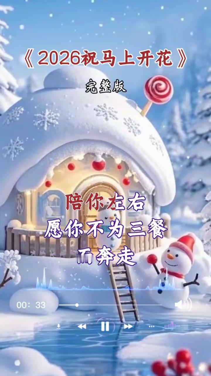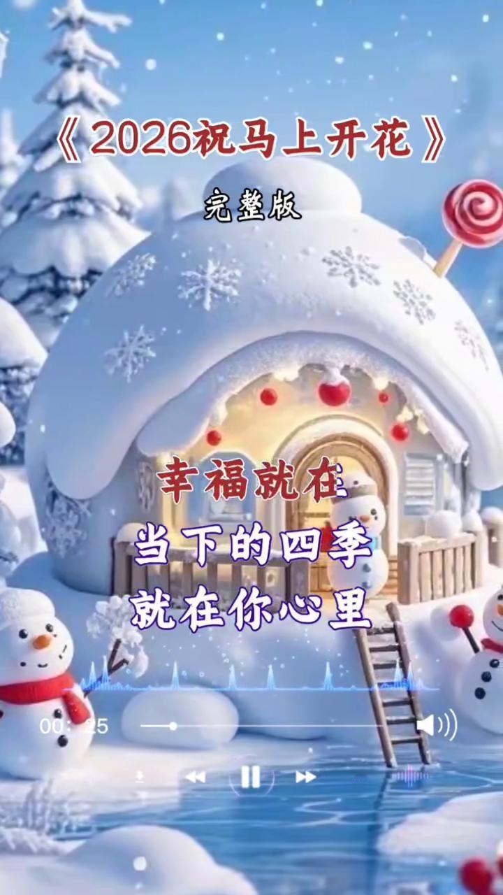 《2026祝马上开花》完整版。 如果蛇年让你不开心,希望马年你能变如意。丢掉烦恼,忘记烦心,一切都重新开始。别再处处为别人考虑,今年开始学会爱自己,幸福就在当下的四季,就在你心里。愿你爱的人陪你左右,愿你不为三餐而奔走,好运在招手,你终将迎来丰收。 马年贺岁,马上有钱,马上发财,马上有福,都开花。马年祝你心想的都成,身体永远健康,马力开足,喜气传四方。马年家家户户笑声扬,祝你在新年一切都顺利,一切旺。