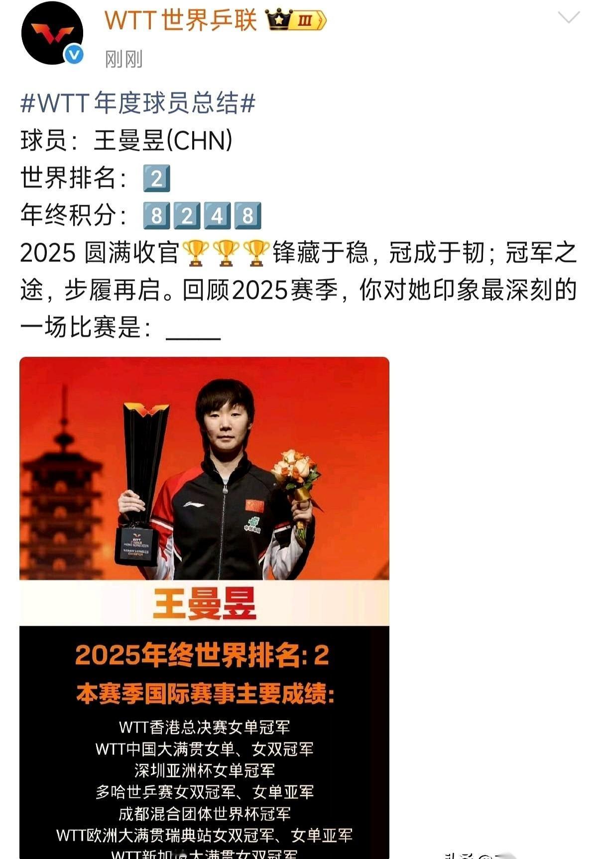 看了王曼昱的年度总结,才真正明白什么叫“外战最稳防线”。 这两个词听着光鲜,背后全是刀山火海。 就是当战局告急,队友的眼神开始躲闪,教练攥着毛巾的手指都发白了,全场的空气凝固到能拧出水来的时候—— 轮到她上场了。 对手的球像炮弹一样砸过来,一板比一板凶,奔着把她打穿去的。整个球馆只剩下乒乓球撞在台面上的闷响,一下,又一下,敲在每个人心上。 镜头给到她,汗顺着头发往下滴,但她的腰杆还是挺得笔直。就在对方以为机会来了,搏杀了一个几乎无解的斜线时,她整个人沉下去,身体瞬间拧紧,反手不是格挡,不是防守,而是用尽全身的力量,硬生生把球从绝境里“拽”了回来,带着风声,直奔对方的空当。 球落地。 教练捏紧的拳头,这才慢慢松开。 什么叫当代女子反手第一人?就是这一板,能把对方所有的气焰,全都打回去。 什么叫外战女皇?就是你永远可以把最难啃的骨头,最不能输的那场球,放心地交给她。