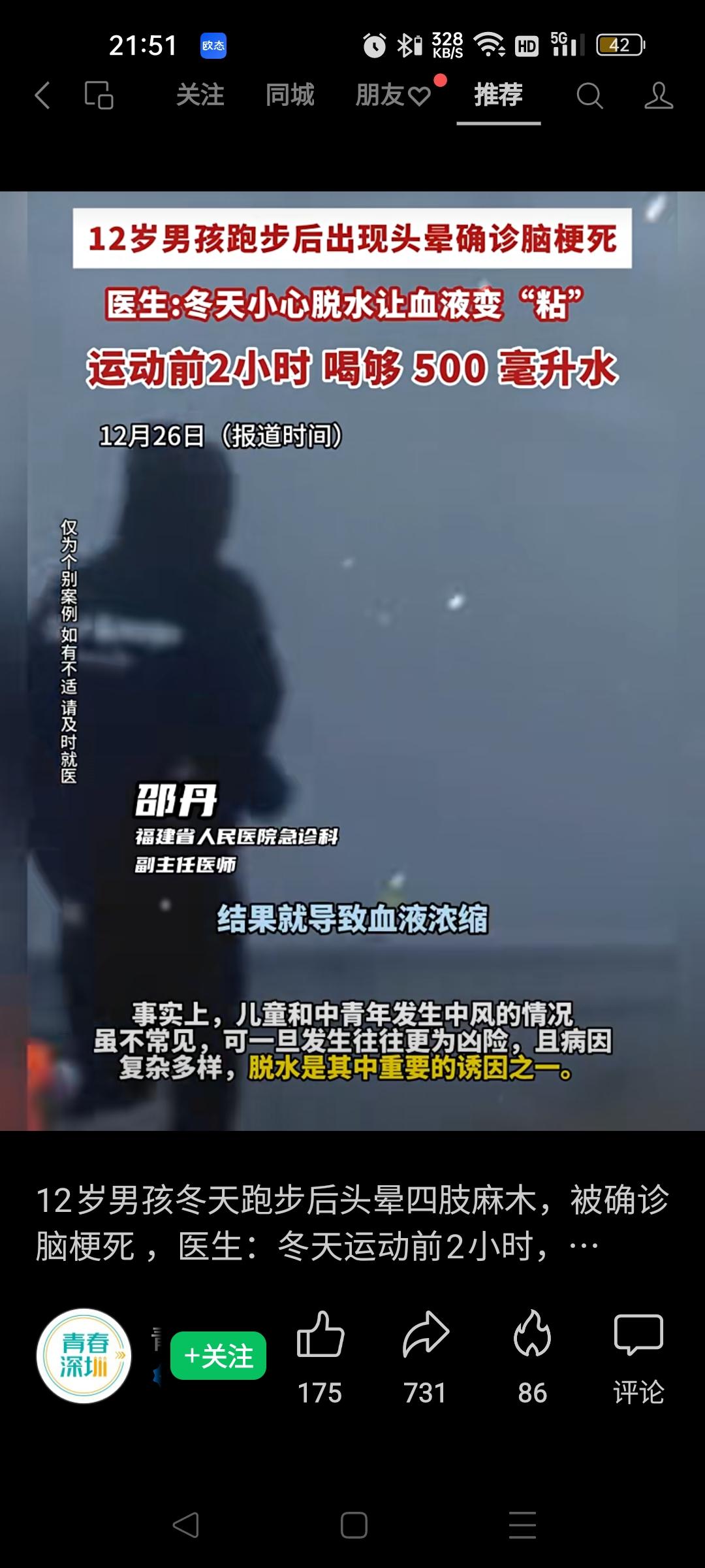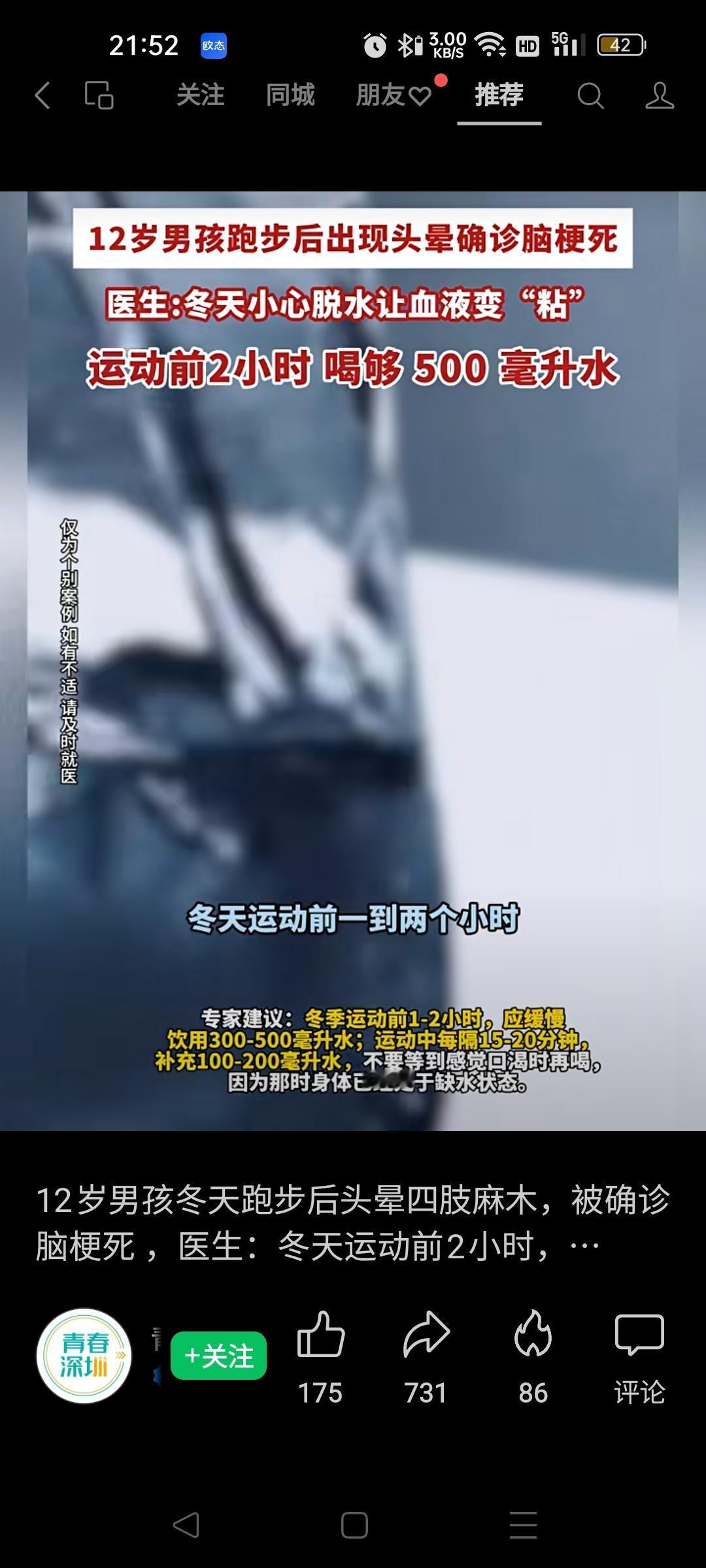 12岁男孩跑步后脑梗,冬天运动安全警钟敲响! 今日热推运动 想象一下,一个活蹦乱跳的12岁男孩,在冬天跑步后竟头晕四肢麻木,最后被确诊为脑梗死,这是多么令人揪心又震惊的事情!当看到这样的新闻,相信很多人跟我一样,心里“咯噔”一下,原本以为脑梗这样的病离孩子很遥远,可现实却给了我们沉重一击。 从人性角度看,我们都觉得孩子就是活力的代名词,运动对他们来说是再正常不过的事。但这次事件却让我们意识到,即便是看似健康的孩子,在运动时也可能隐藏着风险。冬天本就气候干燥,人体水分流失快,而运动又会加速水分消耗。医生提醒冬天运动前2小时要喝够500毫升水,就是怕脱水让血液变“粘”,增加患病风险。可在日常生活中,我们又有多少人会重视这小小的喝水细节呢? 这起事件就像一面镜子,照出了我们在运动安全认知上的不足。很多时候,我们只追求运动带来的好处,却忽略了背后可能存在的危险。无论是孩子还是成年人,运动都应该建立在安全的基础上。 这也给我们提了个醒,在享受运动带来的快乐时,一定要做好充分的准备,了解运动相关的科学知识。 你身边有没有因为运动安全问题而发生的意外呢?对于冬天运动安全,你还有什么更好的建议?快来评论区分享你的看法吧!社会百态社会新闻