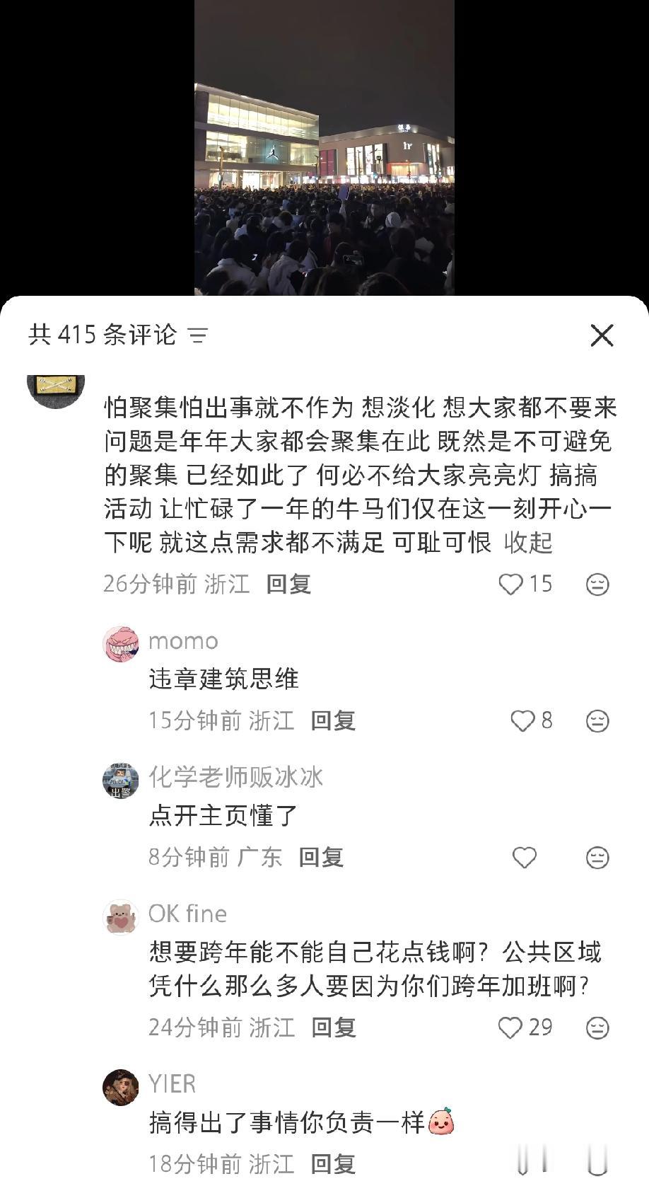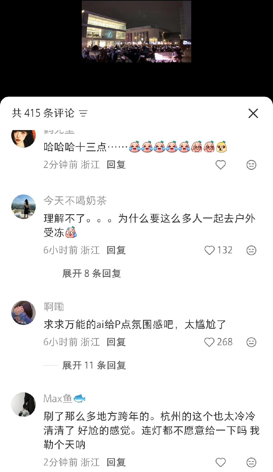 杭州湖滨的这次跨年,被网友形容:“要有多尴尬就有多尴尬,咱也不知道这么多人举着手机对着空中拍什么”!!! 相比于往年、相比于其他地方,杭州的这次跨年确实显得有点冷冷清清,不能放气球也就算了,为什么连大屏幕也给关了呢? 有网友就吐槽:年年大家都会聚居在此相约跨年,想要淡化它,谈何容易,你信不信,即便明年还是不开灯、不放气球,还是会有这么多人来这里跨年。