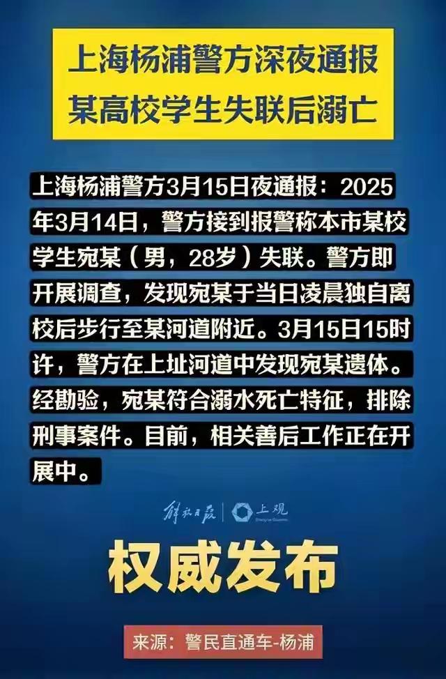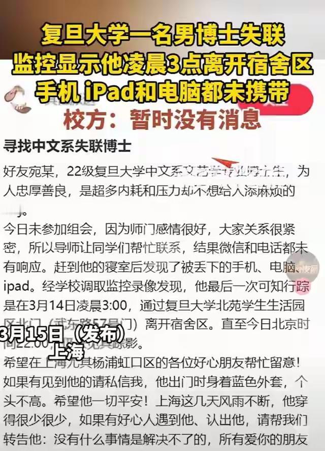 【论文卡壳】 当他熬夜做出论文发给导师,得到回复“重写” 他只穿着卫衣,走进雨夜里,再也没有回头,一头扎进河里 他是复旦博士生,曾经与同学约好去踏青,他的心里苦闷无人倾诉? 有人说太脆弱,经不起风雨,有人说这条路太折磨人,熬过来就是脱几层皮。 结果是他没有熬过来,到底如何?没有人知道?