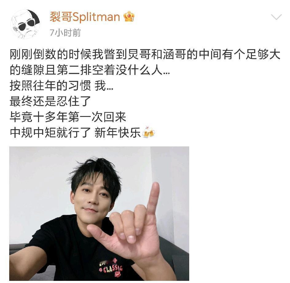 跨年晚会上的苏醒,是属于独自快乐的,陈楚生没在现场吗?期待的楚苏没出现啊[可怜]! 同是在湖南卫视跨年晚会,陈楚生和苏醒0同框!多少有点让人意难平啊! 跨年钟声响起。台上的主持人和嘉宾们纷纷拥抱在一起,各找各的欢乐,只有苏醒默默的掏出了手机在360度自拍。 今年他还是一度想蹭个C位的。最后还是忍住了。算了,第一次回湖南卫视,不调皮了[笑哭]!况且已经给他镜头了,还说了祝福,该满足了吧!苏醒 陈楚生