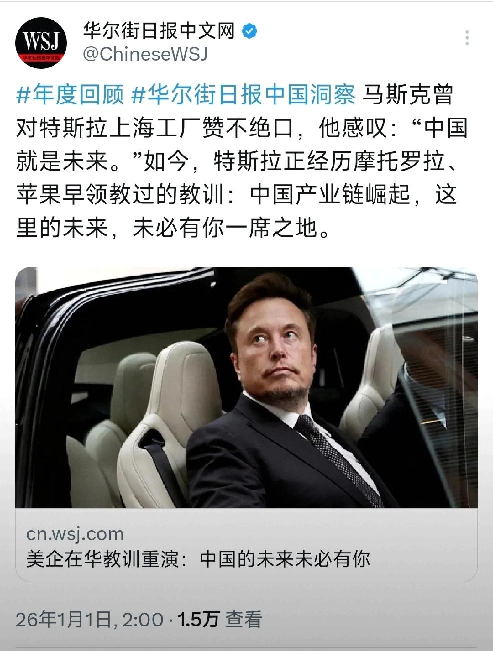 充满诅咒的嘲讽 请看今日报道(2026年1月1日)华尔街日报发布:“马斯克曾对特斯拉上海工厂赞不绝口。他感叹,中国就是未来,如今,特斯拉正经历摩托罗拉,苹果早领教过的教训:中国产业链崛起,这里的未来,未必有你一席之地。” 个人认为:华尔街日报真是令人大失所望,这还是世界权威媒体吗?这还是引导世界舆论的喉舌吗?难道就只会这般苍白无力,充满恶意,充满诅咒的嘲讽和抱怨吗? 睁眼看看:特斯拉的真实数据吧!特斯拉产量的增加,成本的降低,全是凭借中国强大的产业链和高效生产能力铸造的 ,而不是由美国政府的吹嘘而来的 。 个人认为:难道美国的权威报纸只剩下了胡编乱造,用类似诅咒的语言来攻击企业?讽刺人吗?