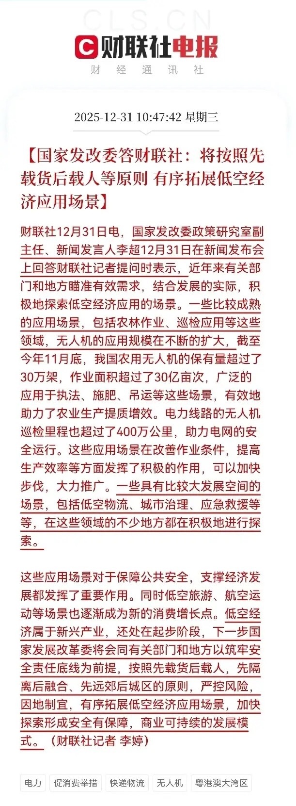 祝大家新年快乐,元旦快乐,2026年这一板块迎来利好催化!发改委此次表态为低空经济的发展描绘了清晰的路径图,其核心在于“有序”与“安全”。“先载货后载人、先隔离后融合、先远郊后城区”的原则,明确了行业将从技术成熟、场景可控的领域(如农林植保、电力巡检)起步,逐步向商业化潜力更大的领域拓展。这一策略既降低了行业初期的试错风险,也为相关企业提供了明确的商业化落地指引,是对整个低空经济产业链的长期实质性利好。受益概念股梳理1. 亿航智能:全球eVTOL行业标杆,EH216-S型号已率先取得适航认证,在广州、上海等城市的载人试飞进展领先,是“载人通航”场景最直接的受益者,具备技术与政策的双重先发优势。2. 纵横股份:工业无人机领域的龙头企业,在测绘、电力巡检等成熟场景市占率领先。当前正积极布局低空物流赛道,与头部电商企业合作探索城市空中配送网络,是“载货物流”场景的核心玩家。3. 海康威视:机器视觉技术全球领先,其AI算法和热成像设备广泛应用于无人机巡检、安防监控等领域。通过为无人机提供“眼睛”和“大脑”,深度参与低空经济的智能化升级。4. 高德红外:红外热成像技术龙头,其红外传感器是无人机避障、夜视和巡检的核心部件。同时,公司在低空安防和监测系统领域具备完整解决方案,受益于低空经济的基础设施建设。5. 光威复材:碳纤维行业龙头,其高性能碳纤维已通过多家eVTOL厂商的验证。轻量化是eVTOL降本增效的关键,公司产品在强度、模量和成本上具备竞争力,需求将快速释放。6. 海格通信:北斗导航与通信设备领军企业,为低空经济提供通信、导航、监视(CNS)一体化解决方案。在低空空管系统(UTM)领域布局深厚,是实现“先隔离后融合”的核心技术支撑。7. 航天彩虹:大型察打一体无人机国家队,技术实力雄厚。随着军用技术转民用加速,其在海洋监测、应急救援等领域的应用不断拓展,同时布局高端复合材料,受益于行业轻量化趋势。8. 中无人机:国内大型固定翼无人机龙头,“翼龙”系列在应急救灾、气象监测等场景表现优异。公司积极拓展海外市场,同时探索无人机物流等商业应用,具备军民协同优势。9. 隆鑫通用:通用航空动力系统供应商,其航空发动机技术成熟,广泛应用于通航飞机和工业无人机。公司布局eVTOL动力系统,同时拓展通航运营服务,构建全产业链能力。10. 星网宇达:惯性导航系统核心供应商,其高精度导航技术是无人机实现自主飞行、精准降落的关键。在无人系统和智能驾驶领域技术同源,受益于多场景的智能化需求。11. 德赛西威:智能驾驶技术龙头,其域控制器、传感器等产品可直接应用于eVTOL的飞控系统。在车规级产品上的技术积累,使其在安全性和可靠性上具备优势,有望成为eVTOL核心供应商。12. 万丰奥威:通航飞机制造与运营服务商,拥有完整的通航产业链。其钻石飞机在私人飞行、飞行培训等领域市占率领先,同时布局eVTOL产业,受益于低空旅游等消费场景的兴起。13. 中科星图:数字地球与卫星遥感龙头,其GEOVIS平台可实现对低空领域的实时监测与管理。在低空空域管理、飞行流量监控等领域提供核心数据支持,是低空经济的“数字底座”。14. 长鹰信质:电机及核心零部件供应商,其微特电机广泛应用于消费级和工业级无人机。在无人机动力系统领域具备规模化和技术优势,受益于无人机整机需求的增长。15. 炼石航空:航空零部件制造企业,其航空发动机叶片、机匣等产品技术含量高。公司布局通航业务,同时为eVTOL厂商提供轻量化结构件,具备高端制造能力。16. 威海广泰:空港地面设备龙头,同时布局无人机和通航运营服务。在机场无人机管控、应急救援无人机等领域具备解决方案能力,受益于低空经济的运营服务需求。17. 新北洋:智能设备与系统解决方案提供商,其物流分拣设备与无人机末端配送系统形成协同。在快递物流、仓储自动化等领域经验丰富,是低空物流落地的重要参与者。18. 华测导航:高精度卫星导航定位龙头,其RTK技术大幅提升无人机作业精度。在测绘、农林、电力等领域的无人机应用中,提供核心定位支持,技术优势明显。19. 合众思壮:北斗导航终端与解决方案供应商,其产品广泛应用于行业级无人机。在高精度定位、导航授时等领域具备技术积累,受益于北斗系统在低空经济的全面应用。20. 雷科防务:雷达与电子对抗企业,其毫米波雷达可用于无人机避障和安防监控。在低空空域监测、无人机反制等领域提供核心技术,是保障低空安全的关键环节。总结此次政策的发布,标志着低空经济从“概念探索”进入了“有序发展”的新阶段。受益的产业链条长、覆盖面广,从上游的材料、零部件,到中游的无人机制造、通信导航,再到下游的物流运营、场景服务,均蕴含投资机会。本文涉及资讯、数据等内容来自网络公共信息,仅供参考,不构成投资建议!
