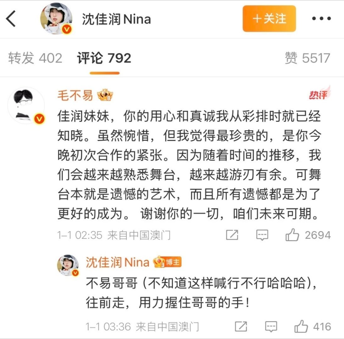 不出意外,意外又发生了,江苏卫视跨年演唱会上,沈佳润和毛不易合唱《不染》,沈佳