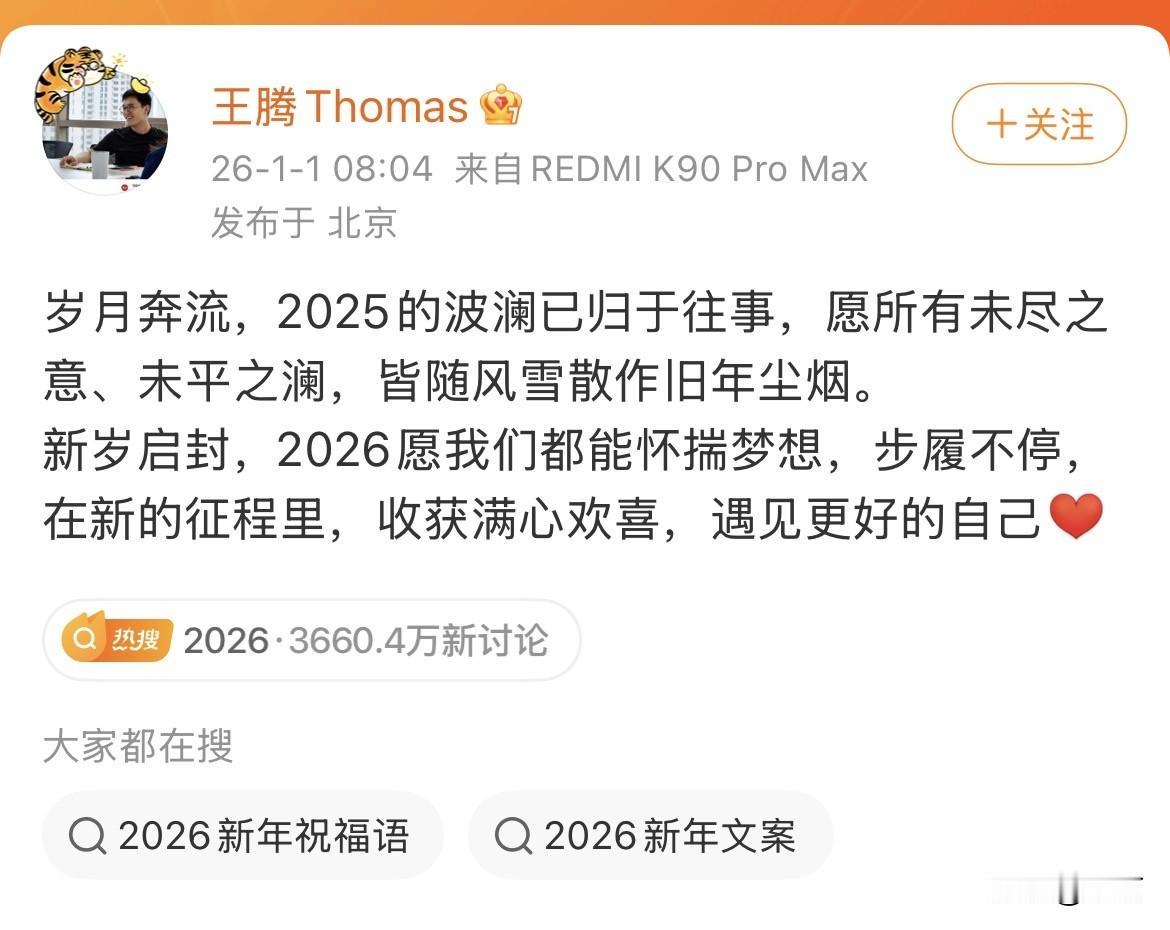王腾:2025的波澜已归于往事! 今天上午,王腾8:00过就起床了,发出来了2026年的新年信息。 他在这条信息,第一句话就是去年所有的事情都算得上是往事了,不管怎么样都已经过去了,所以2026年对他来说是全新的开始。 他也在评论区积极的与每个人互动,很多人都在问他今年准备干什么,其实之前他就说了,他准备自己创业做事情。 看来现在还在准备当中,毕竟他也希望在今年能够收获满满,至少能够在新的事业上有所起步,上次自从被开了,现在他已经休息好几个月了,新的一年他是要干点事情了。 毕竟他在这个行业干了这么久,他在专业能力上,人脉上,他无论做产品,还是做供应链,或者自己完全单干,他也有这个能力快速起手的。 不管怎么样,2026年对他来说又是一个全新的开始了,不知道今后他的新身份是不是腾总,或者腾哥,唐师傅[捂脸],那时候我们看看他到底会干啥,拭目以待。