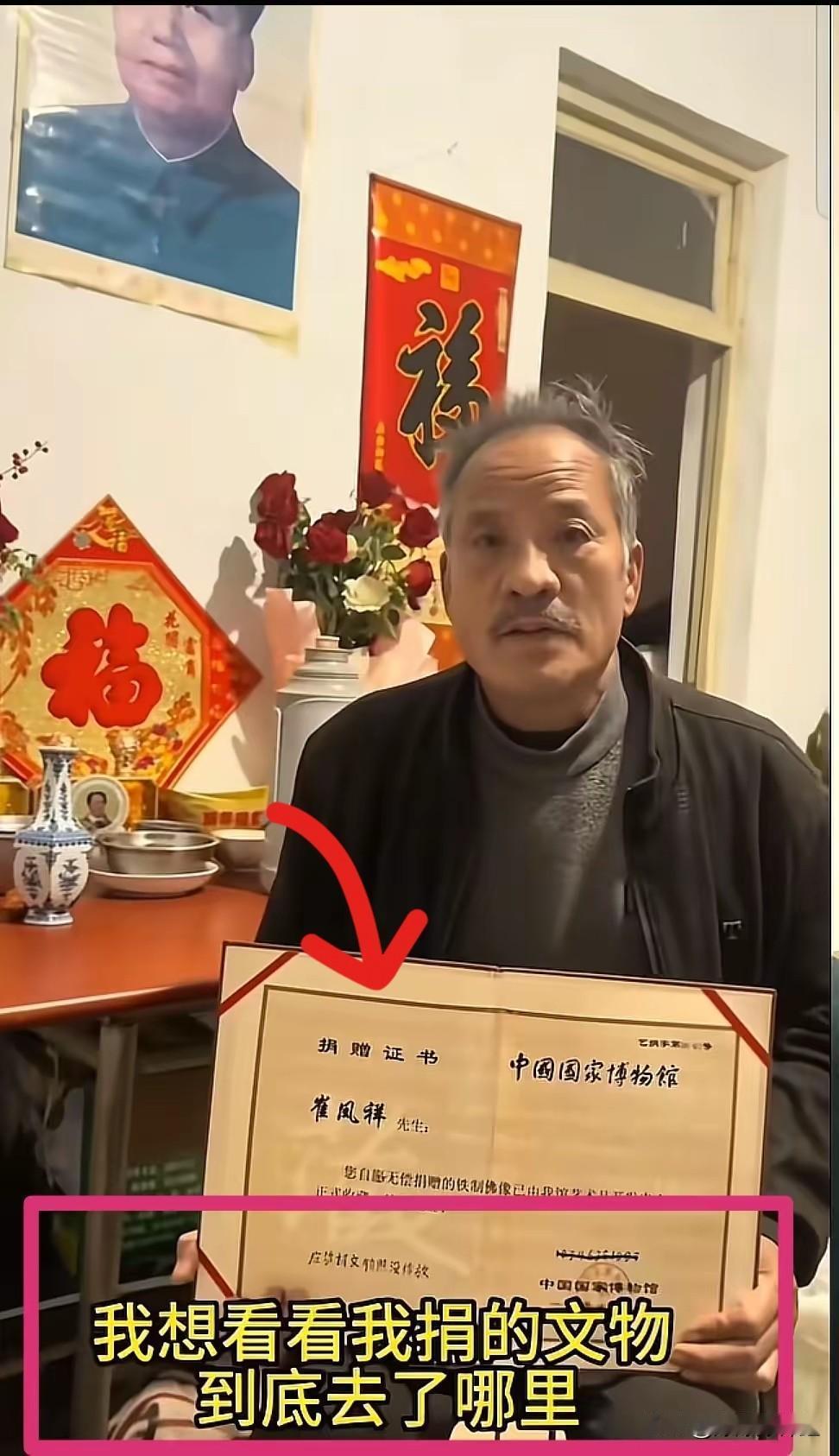 大过节的,看着真让人堵得慌。 一位姓崔的大爷,手里攥着身份证和2006年的捐赠证书,站在那儿就想讨个说法: “我捐给国家的佛像,到底弄哪儿去了?” 当年明明盖了章,也有接收人,结果这东西在国博就像人间蒸发了一样。 最离谱的是,居然还要大爷自己去找当年的经办人?这是国家博物馆还是菜市场啊? 大爷住着破房子,守着穷日子,明明可以把文物卖了安享晚年,人家却选择了无偿上交。 结果呢?档案没了,东西不见了,一句“没记录”就想把人打发了? 这一盆冷水泼下来,寒的不仅是老人的心,咱们以后谁还敢往上交东西? 这么大个单位,连个文物都管不住,说不过去吧。